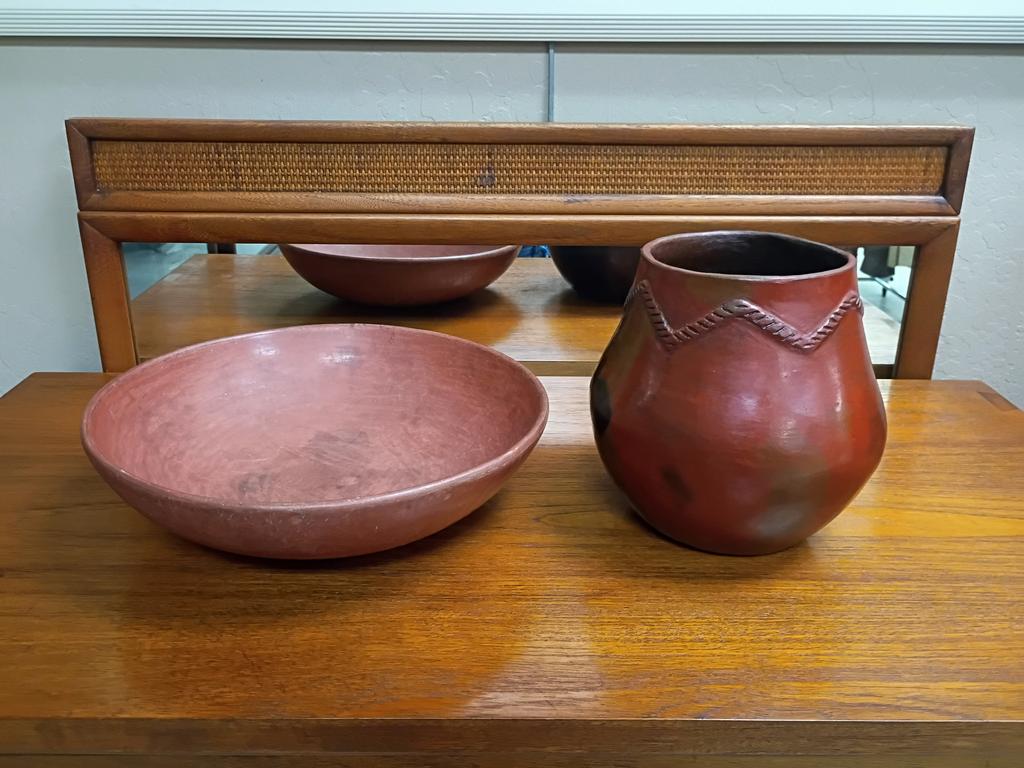 Rose Williams Navajo drum jar & Dine / Navajo red glaze bowl. 8" tall, 14" diameter.