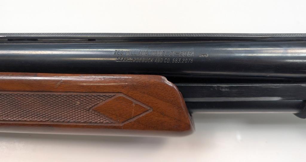 Sears, Roebuck and Co, "Ted Williams" Model 21 pump action 20 gauge shotgun. No serial number. Black, 25 in. barrel.