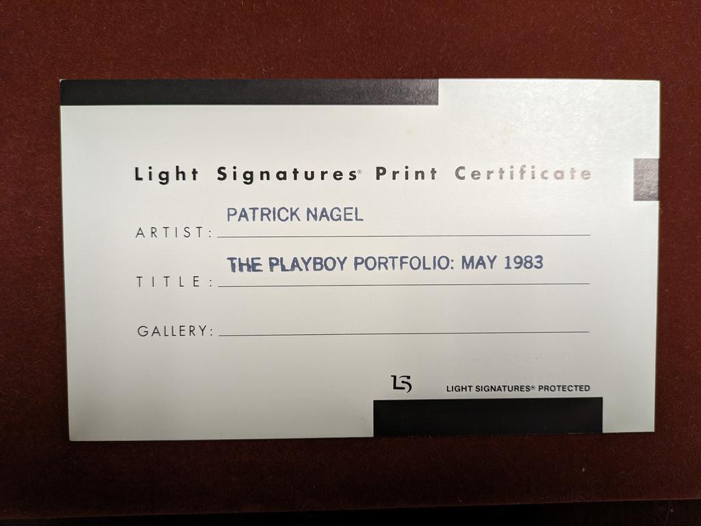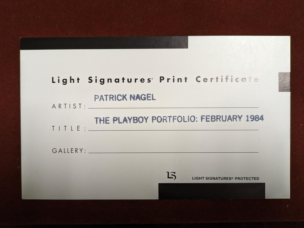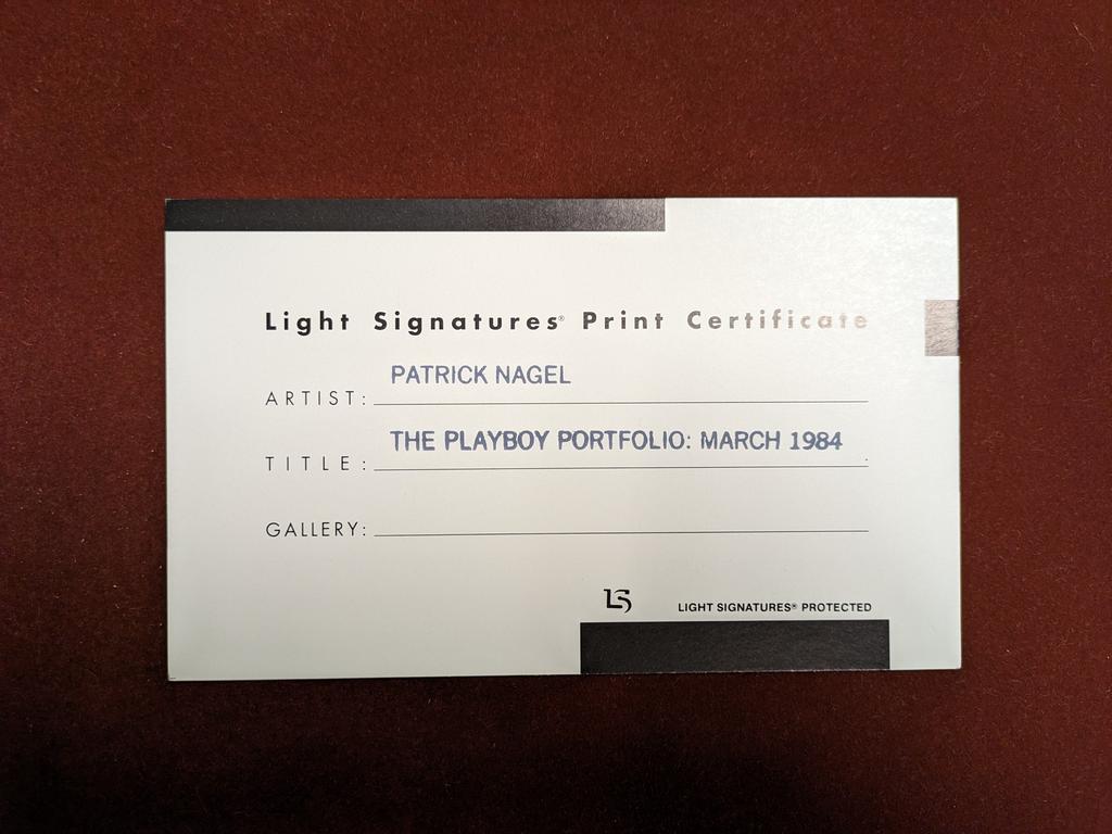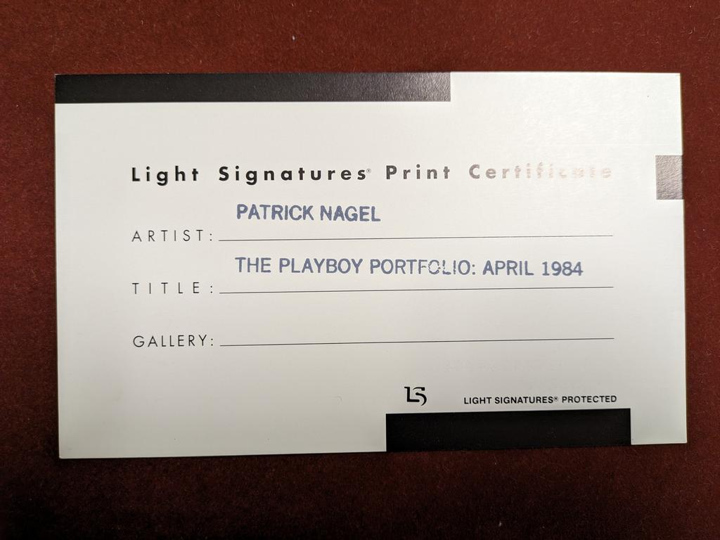 Set of (4) Patrick Nagel Playboy Portfolio II serigraphs. Signed by Jennifer Nagel Dumas, set #663/1250. Published by Mirage Editions. In association with Jennifer Nagel Dumas and Playboy Magazine. Copyright 1989 Playboy-Dumas Ltd. With 4 Light Signatures Print Certificates with the titles Playboy Portfolio: May 1983, February 1984, March 1984, April 1984.