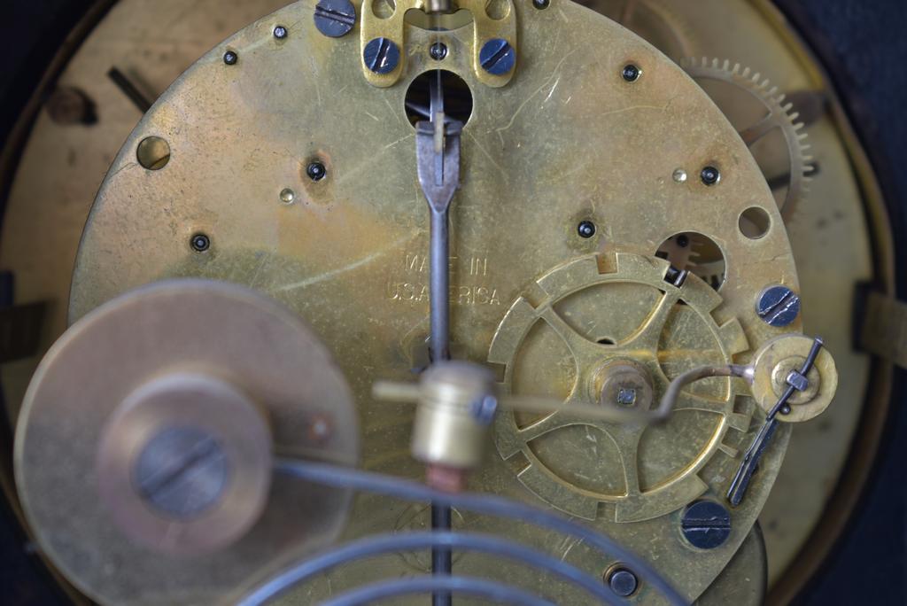 Seth Thomas oak cased mantel clock. Enameled dial with Arabic numerals, time and strike. 8.5" W, 5.5" D, 10.5" H.