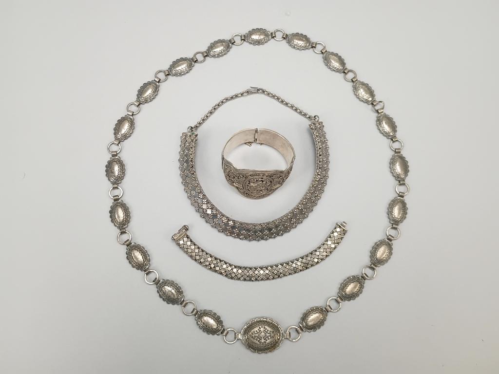 Silver metal necklace, choker & 2 bracelets.