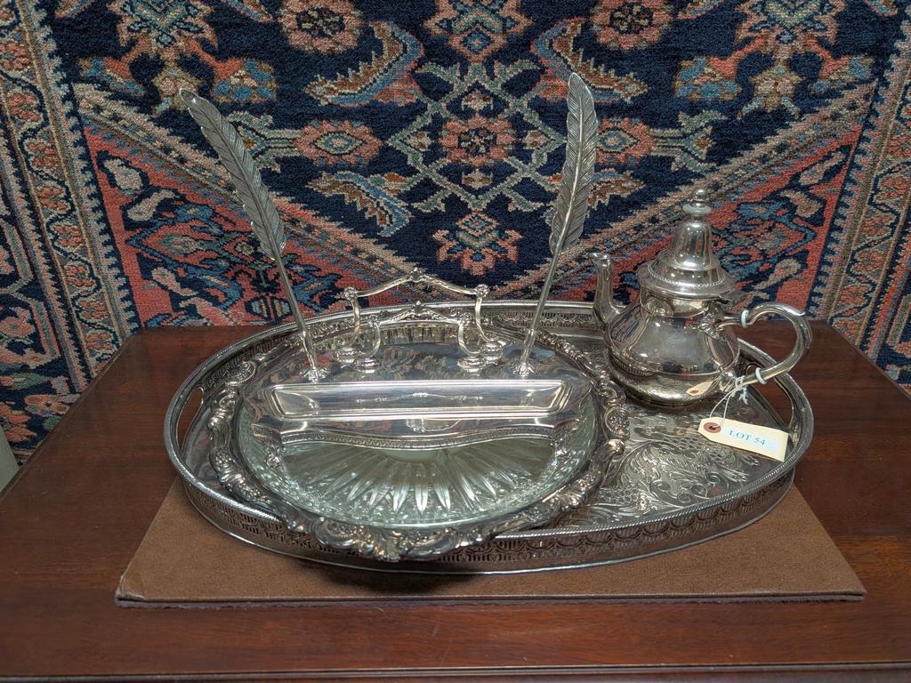 Silver Plated Teapot, Pen Stand And Oval Tray.