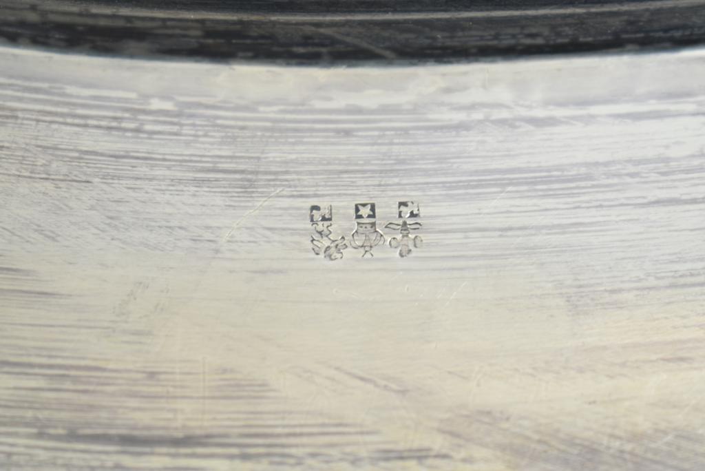 Reed & Barton "Regent Chased" silver plate 3-pc coffee set and E.G. Webster silver plate tray. Tray: 20 1/4" x 15 1/4".