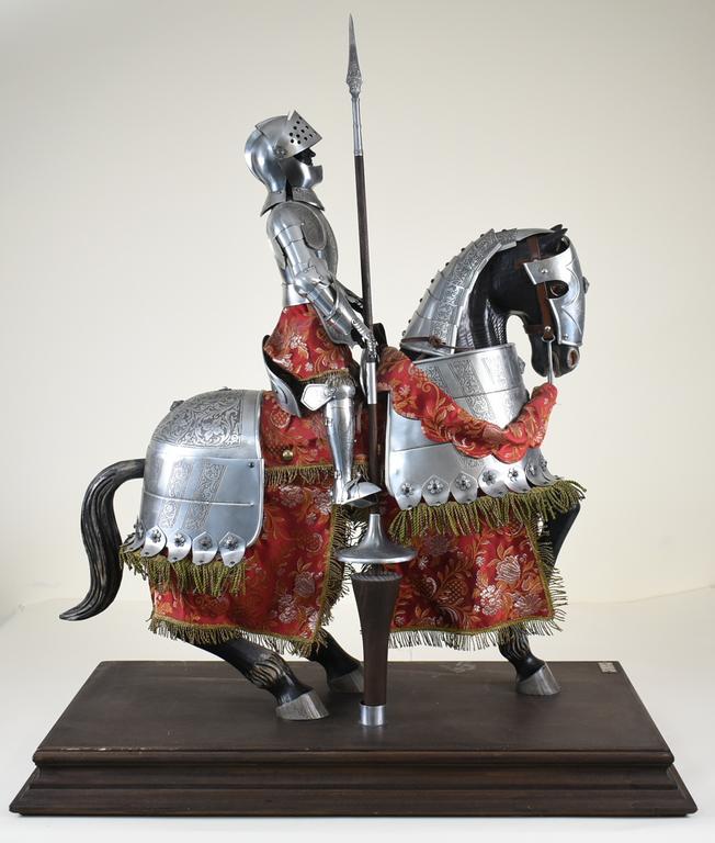 Spanish jousting knight suit of armor by Marto, Spain. Renaissance tournament jousting armor and jousting lance. On Wooden base. Overall: 41" H, 35" W, 18.5" D.