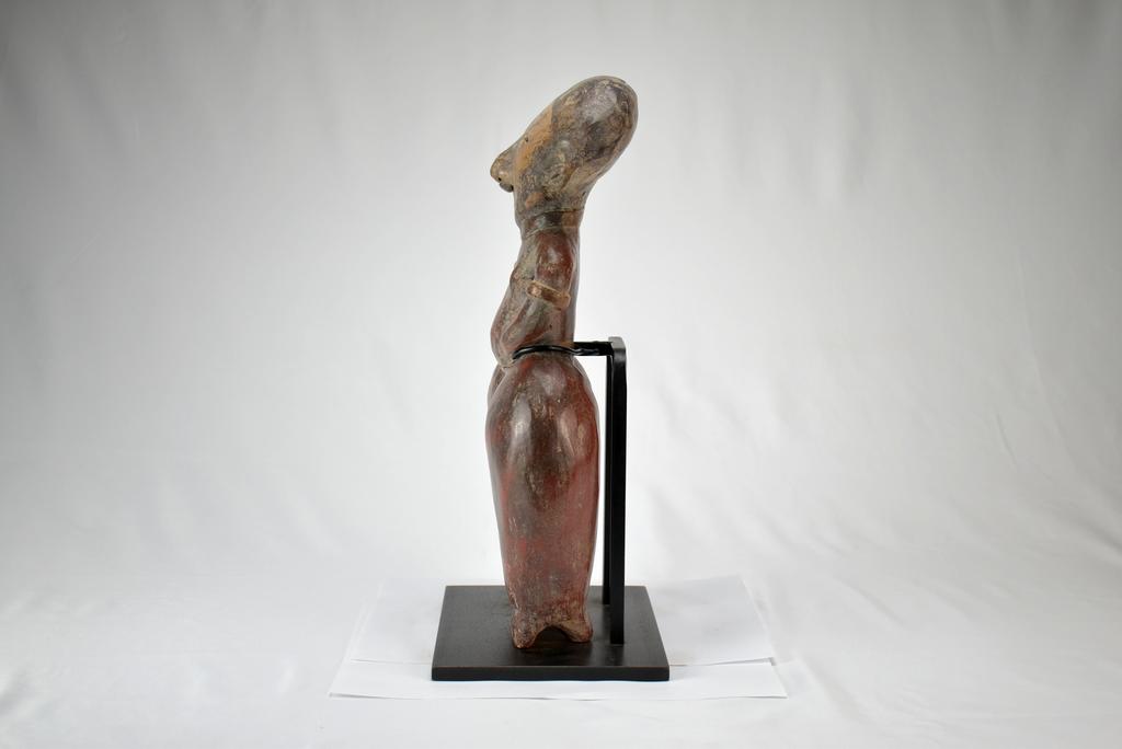 Standing Chinesco female figure, San Sebastian, Red, 300 B.C. - 400 A.D. Well rounded legs, thin arms at waist, flattened facial plane with high cheek bones and tiny slit mouth. 7 1/4" W, 3" D, 14.5" H. On a metal stand / holder. Overall: approx. 8" W, 6" D, 15" H.
