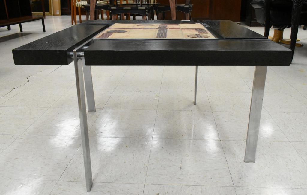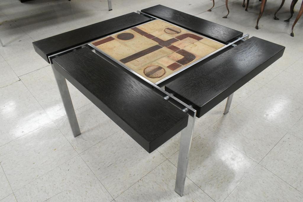 Svend Aage Jessen Coffee and end table set. Tile, chrome and wood with open work design. Sejer mark on the coffee table tile. Coffee table: 58.5" x 36.5" x 19". End table: 30.25" x 30/25" x 19".