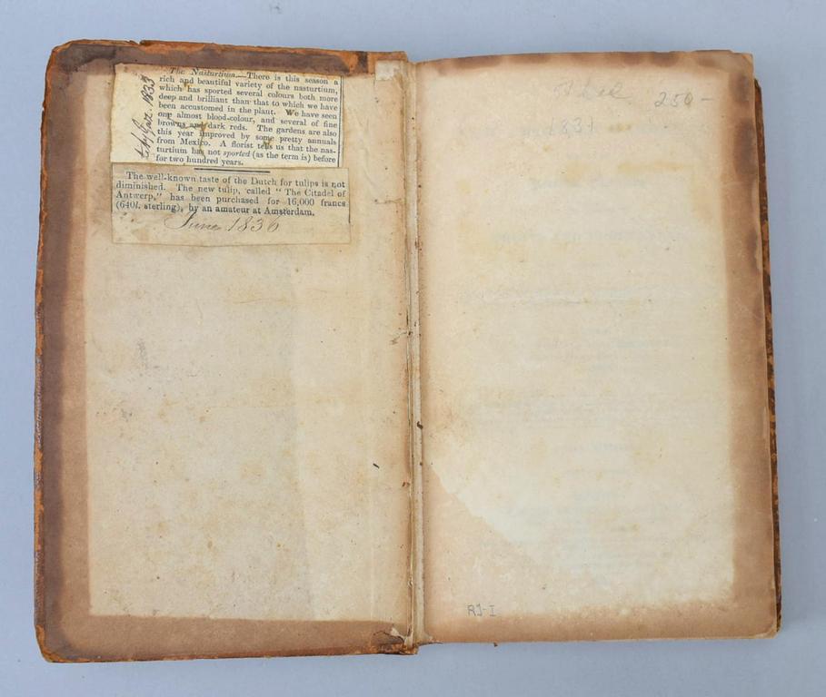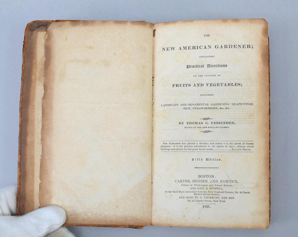 The New American Gardener by Thomas G. Fessenen, Edition of the New England Farmer. Carter, Hender & Babcock, 1831. Containing Practical Directions on the culture of Fruits and Vegetables including landscape and ornamental gardening, grape-vines, Silk, Strawberries. Fifth Edition, leather bound. 306 pages.