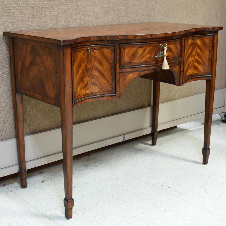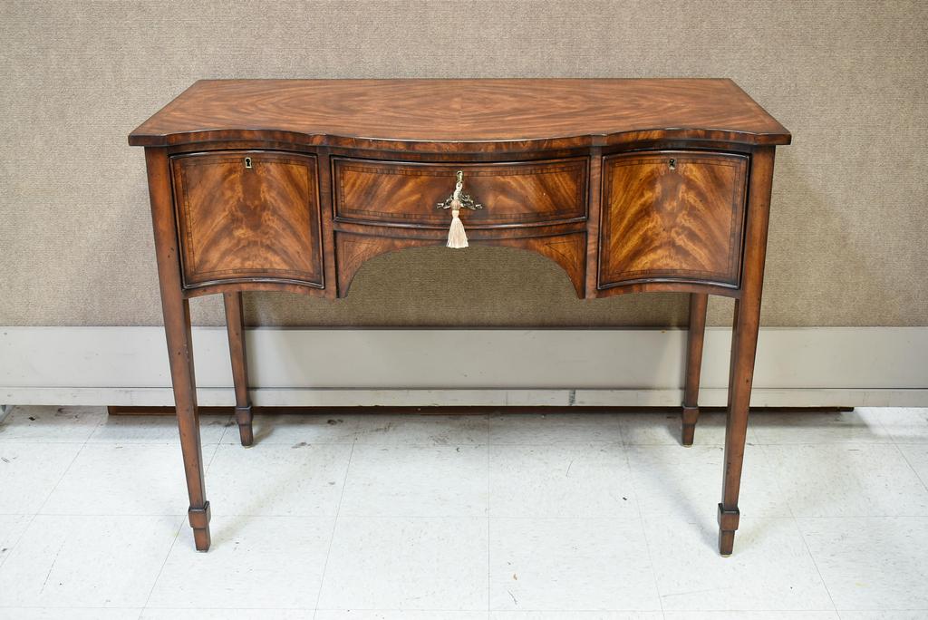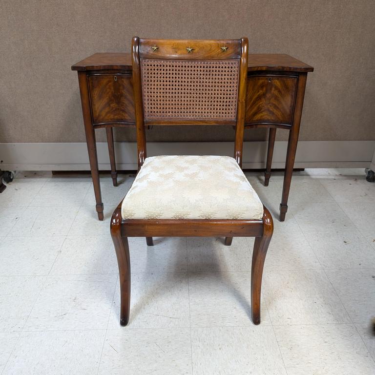Theodore Alexander Althorp Living History sideboard and chair, models AL53006 & Al40004. Flame mahogany with ebony line inlay with serpentine front, central frieze drawer and 2 cellarette drawers. Althorp Theodore Alexander shield. 42" W, 21.5" D, 32" H. Cane back and upholstered seat chair.