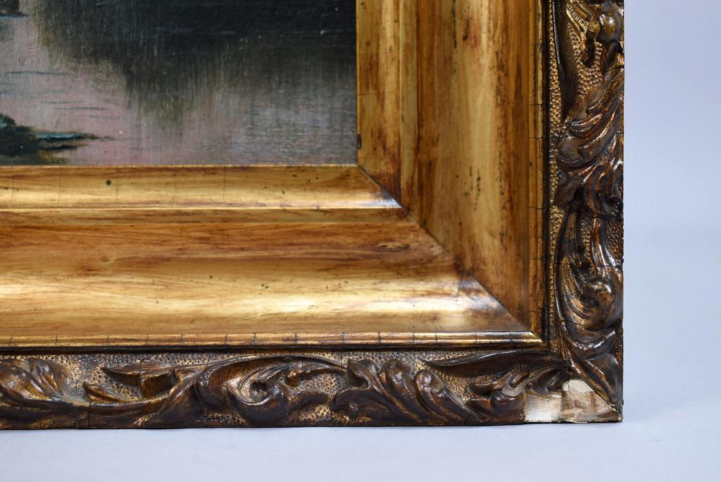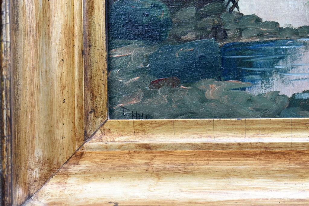Thomas Hill (1829 - 1908), Oil on board, Mountain Lake scene. Signed lower left, T. Hill. 12" x 8.5". Framed, overall: 16 1/4" x 13".