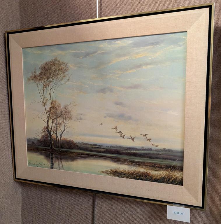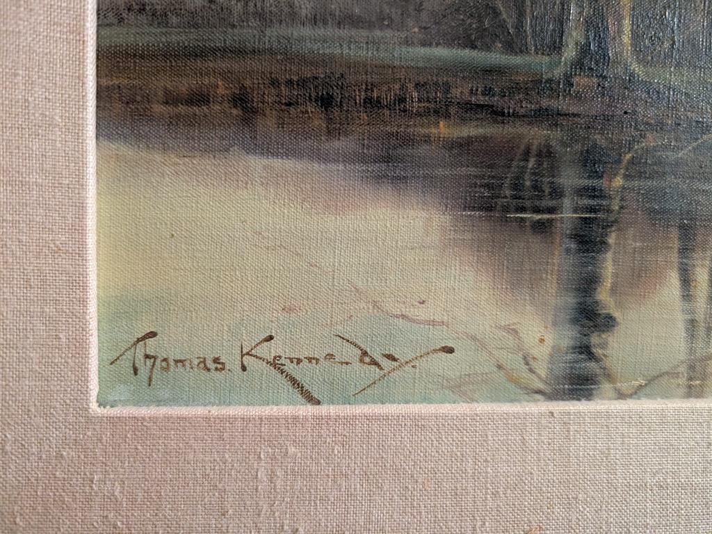Thomas Kennedy oil on canvas, On the Banks of The Roding, Essex. Signed lower left. 22" x 28". Framed, overall: 27.75" x 33.5".