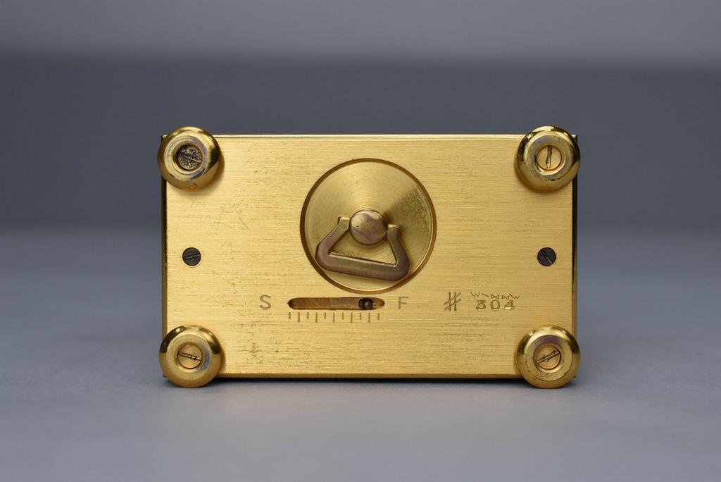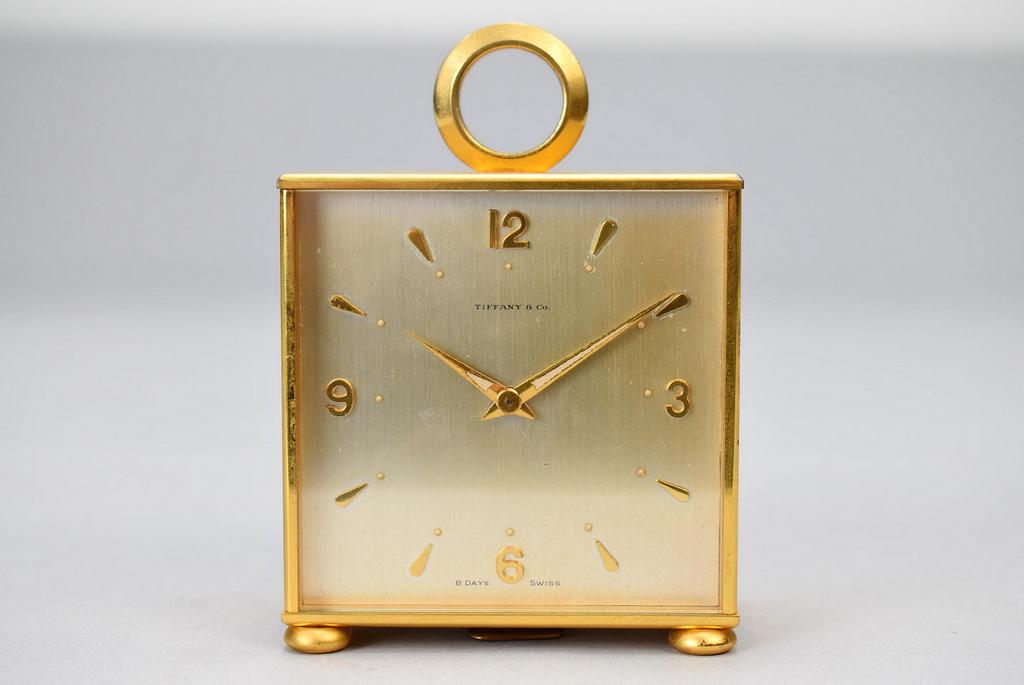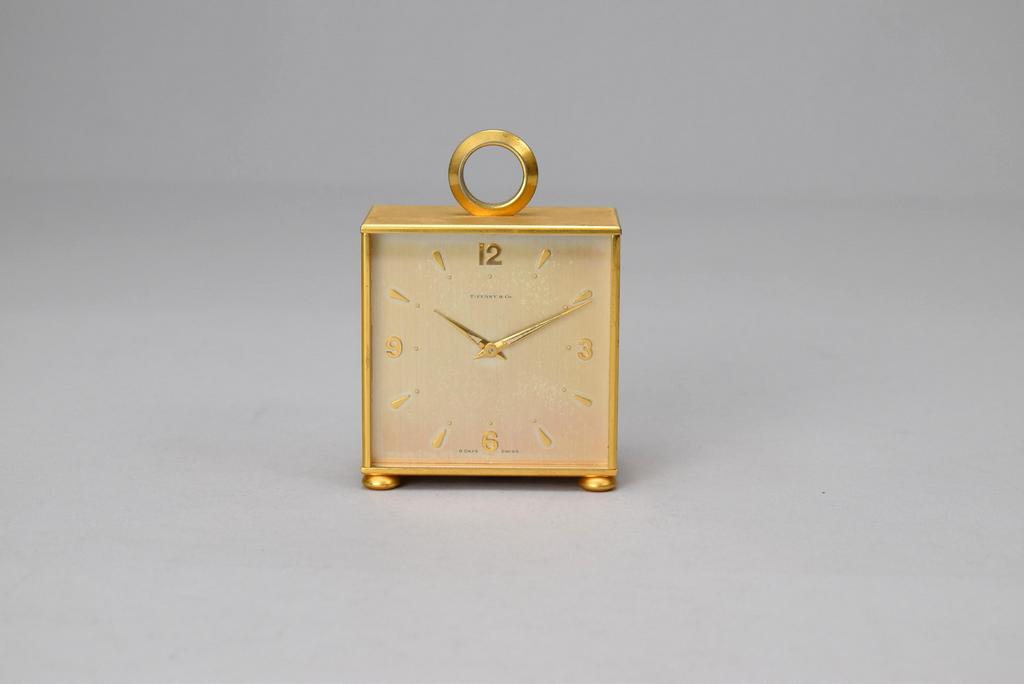 Tiffany & Co. Art Deco style double face clock with loop handle. 2.75" W, 1.75" D, 3.75" H.