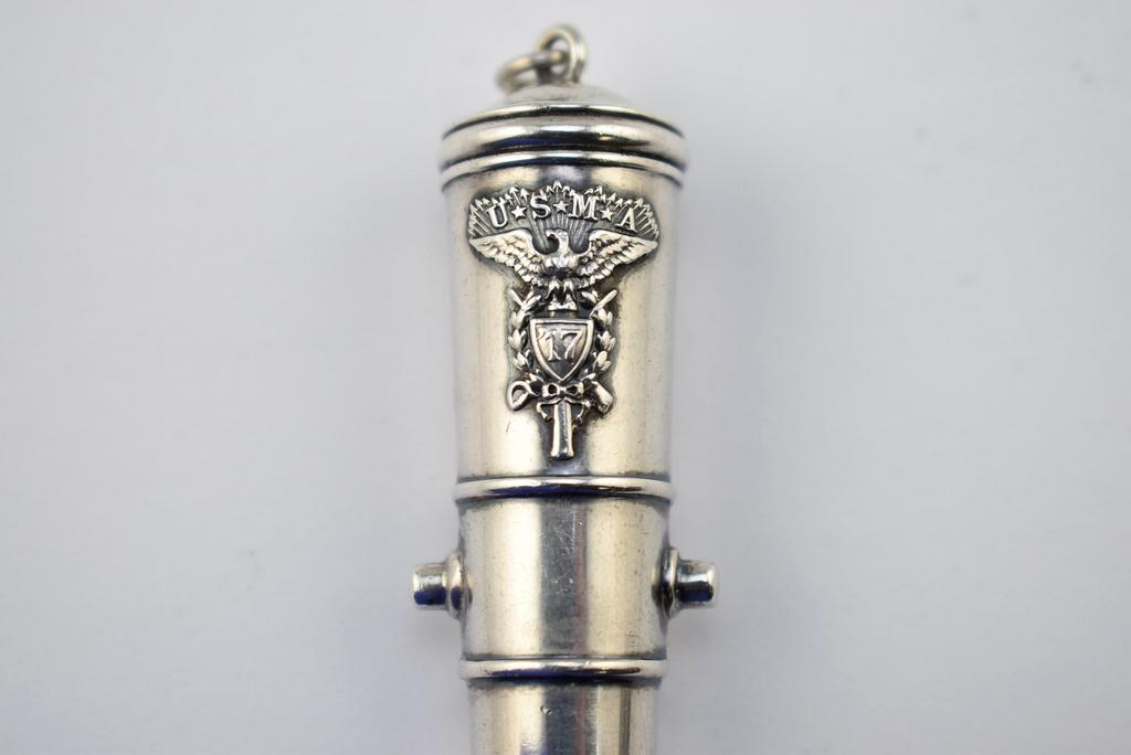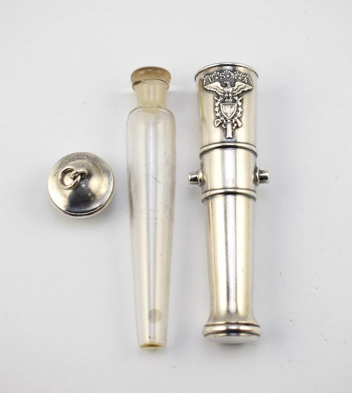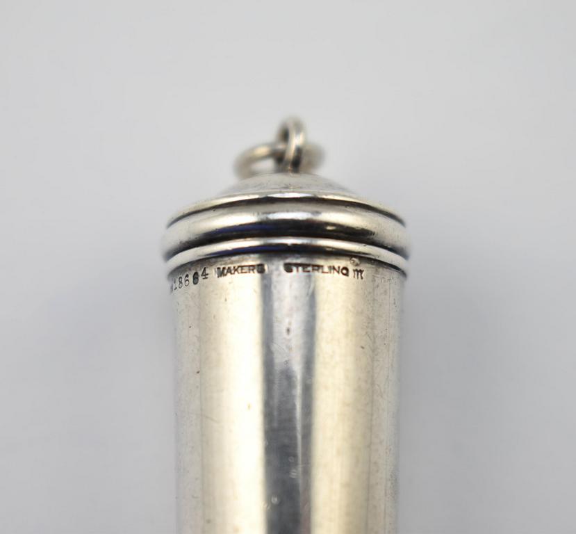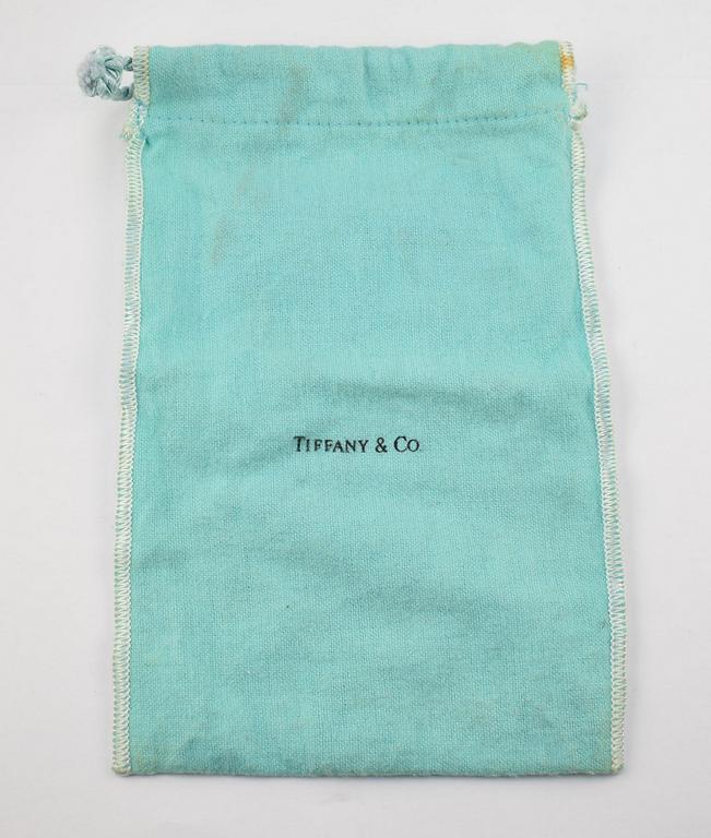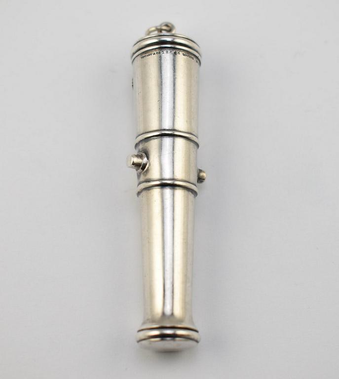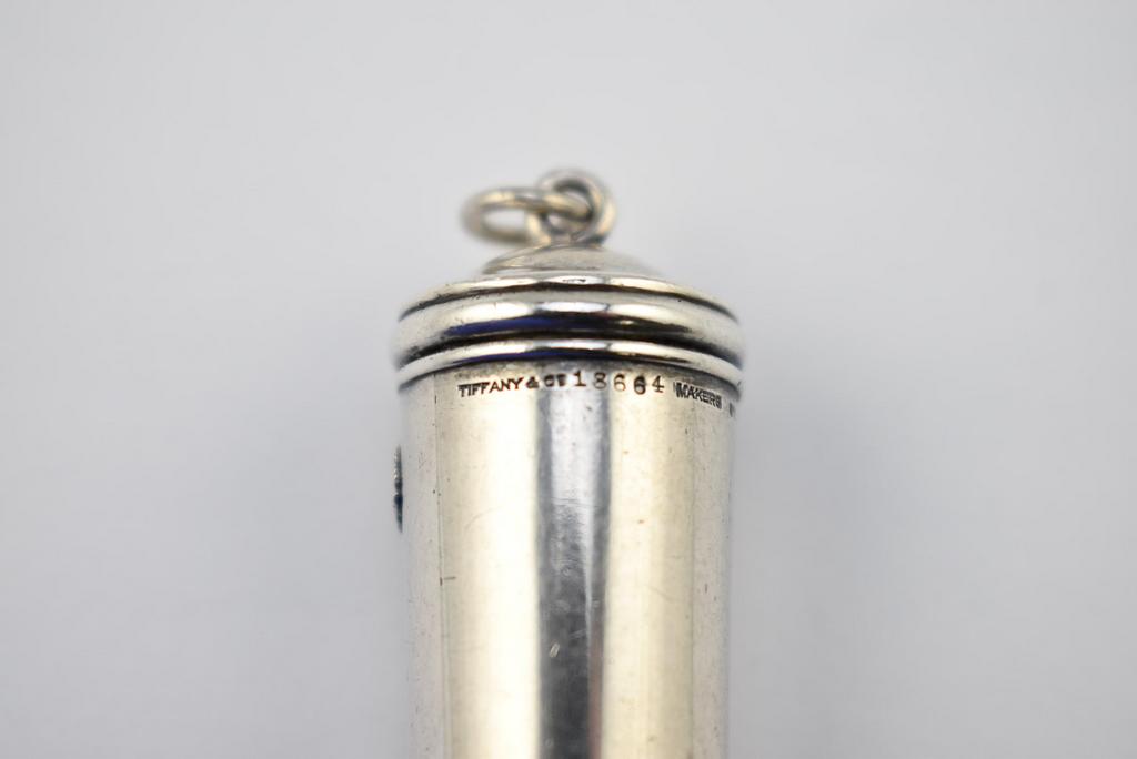 Tiffany & Co. Sterling Silver perfume vial holder with bail. Marked Tiffany & Co. 18664 Makers Sterling 'M'. 3 1/8" long. 0.80 ozt. With a cloth bag and box.