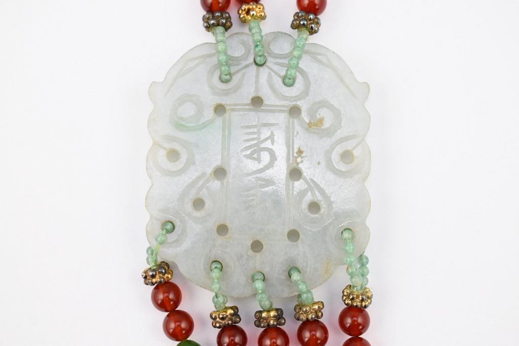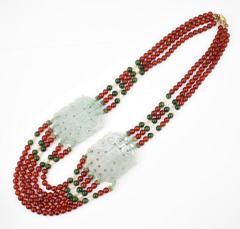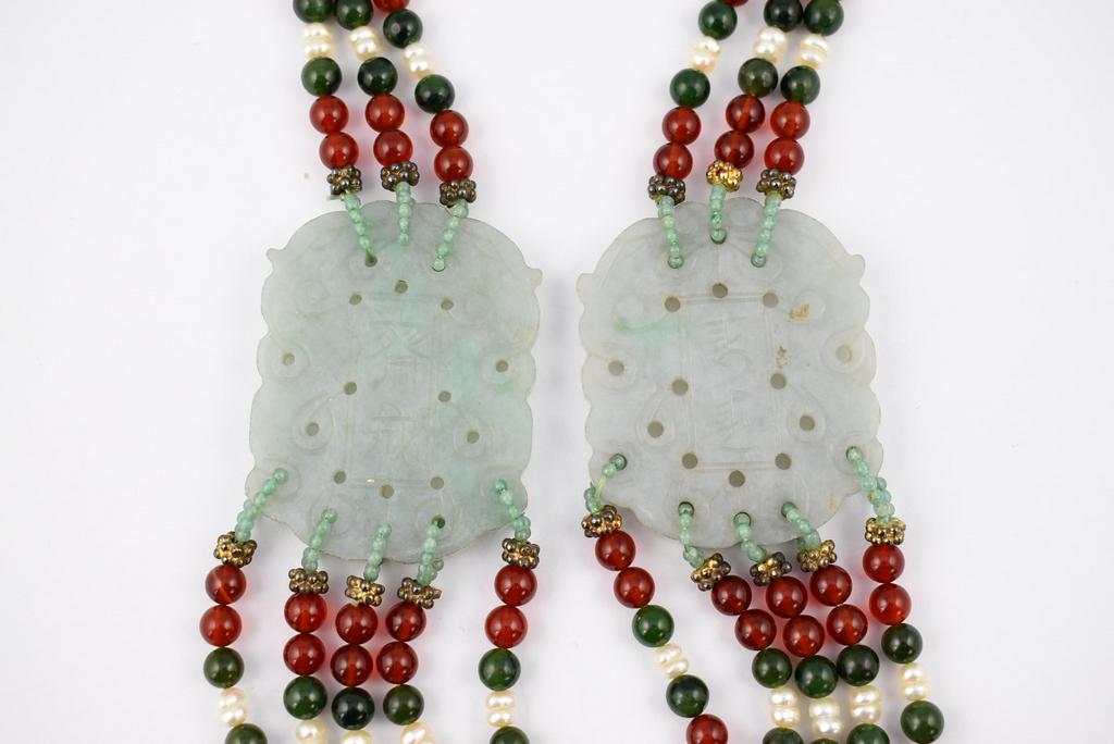 Triple strand necklace with 2 jade toggles (2 1/4" x 1 3/4" each). 11.5" drop length.