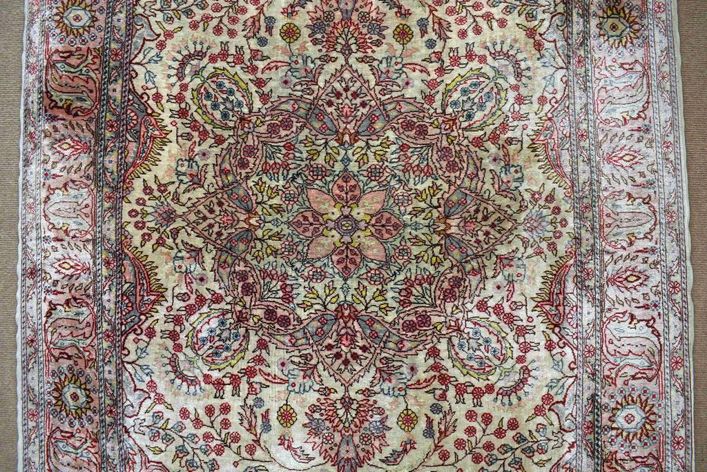 Turkish Kayseri silk rug. Central floral medallion on ivory ground, coral palmette and vine border.