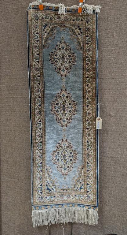 Turkish Kayseri Silk Runner. Light Blue Field With 3 Medallions. 3'11" X 1'4".