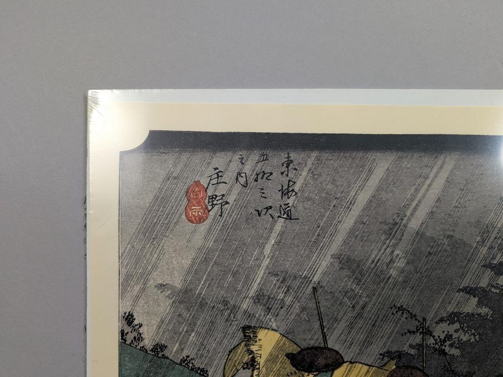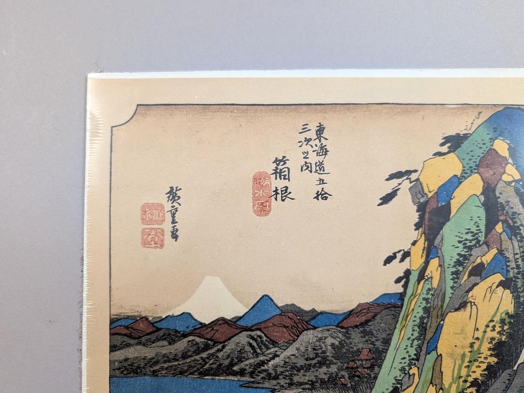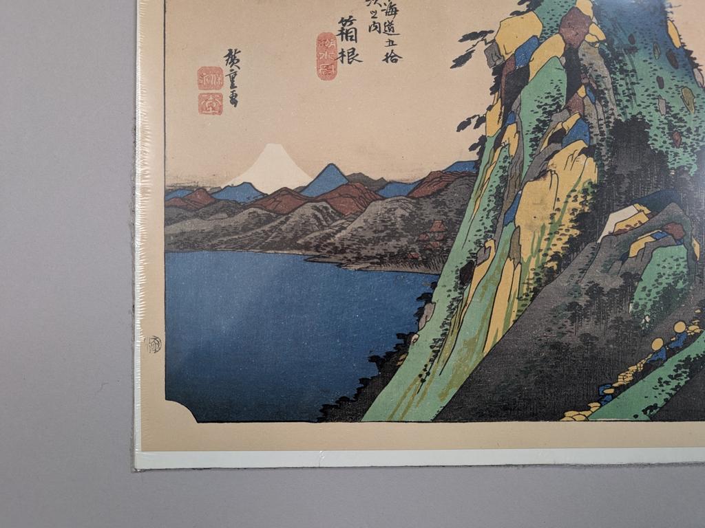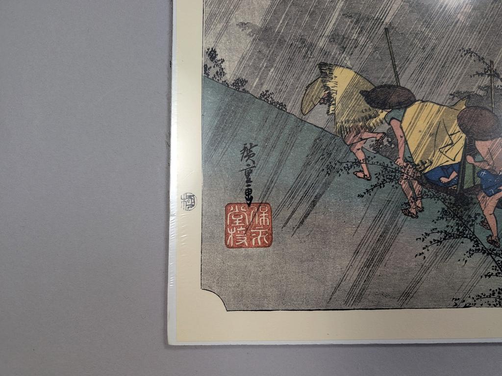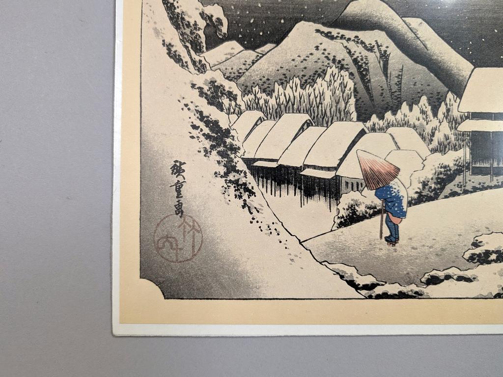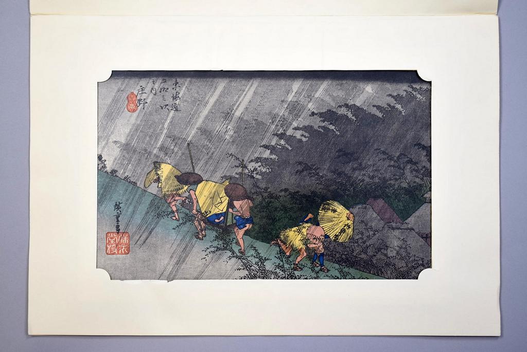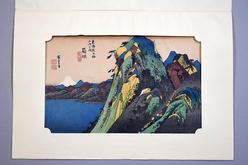 Utagawa Hiroshige, 3 Woodblock prints, scenes from 53 Stations of Tokaido. Hakone, Kambara, Shono. 10" x 14 3/4". Unframed, wrapped in plastic.
