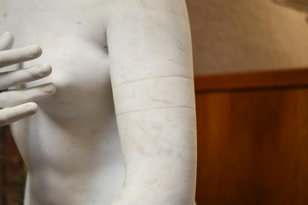Venus de Medici white marble sculpture. From the original by Cleomenes son of Apollodorus. 44" tall. (Left forefinger and middle finger broken).