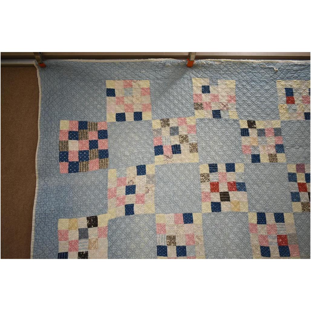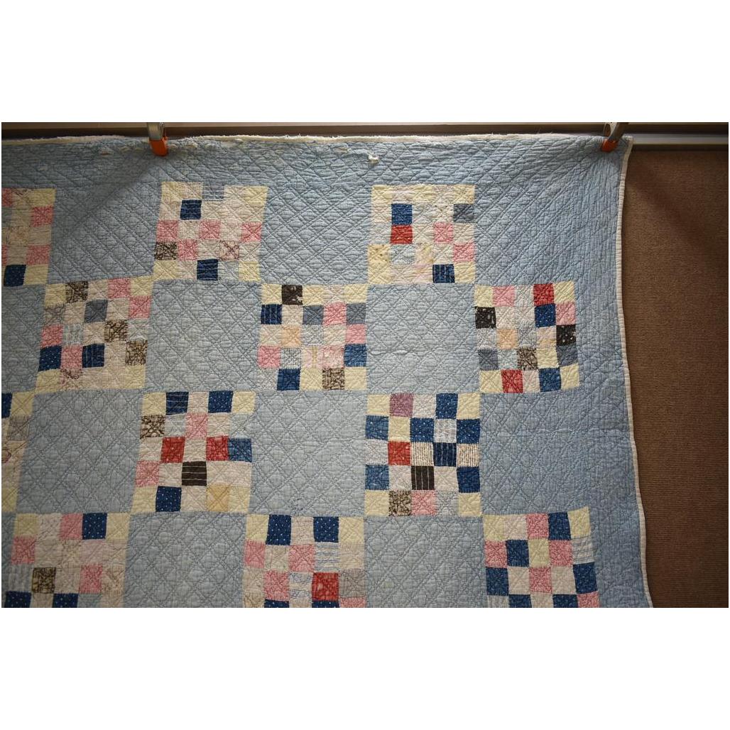 Vintage American hand made quilt. Light blue with 25-patch patterns. 80" x 65".