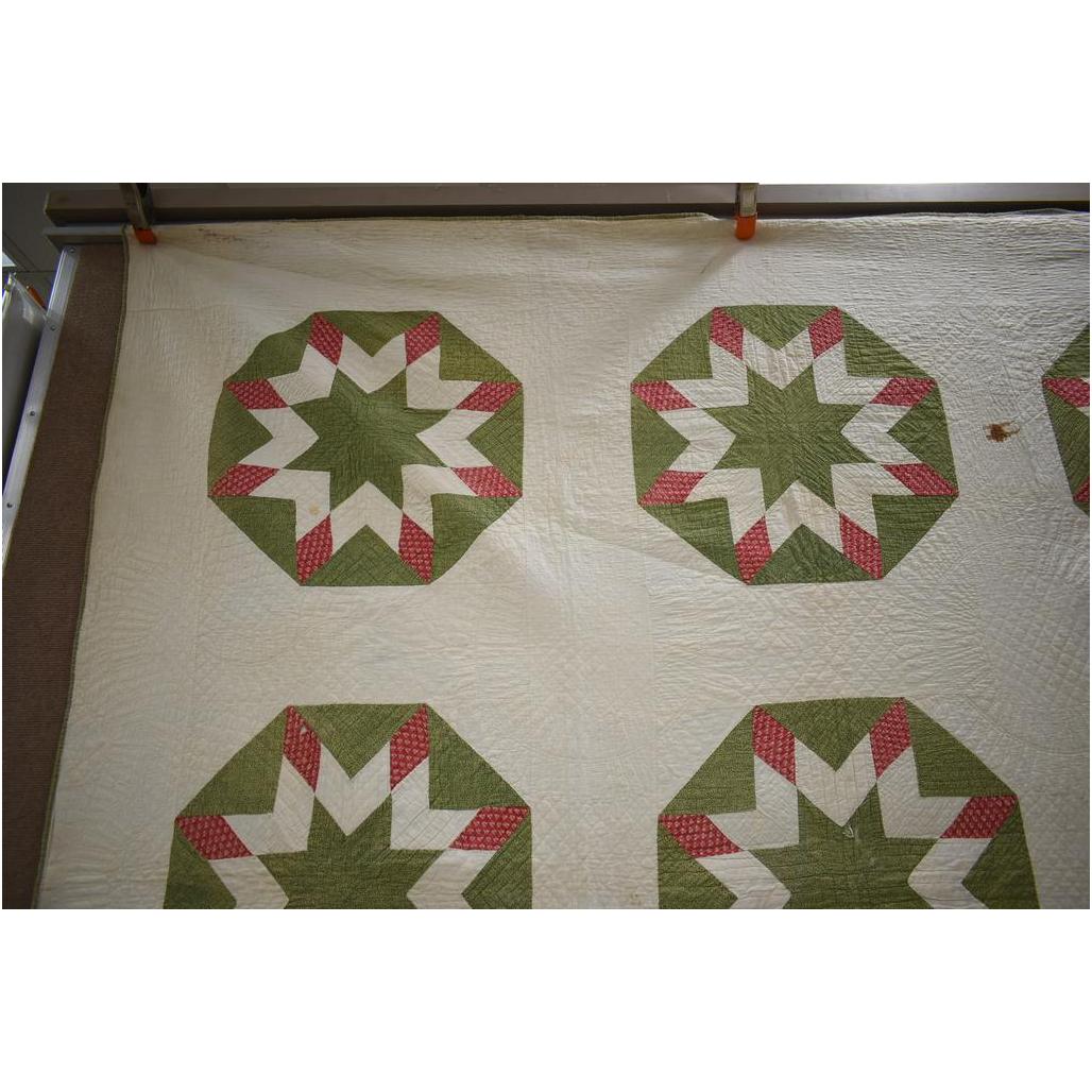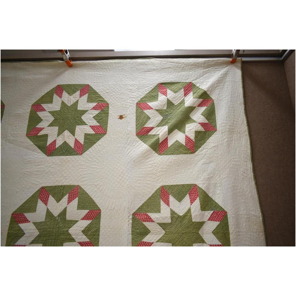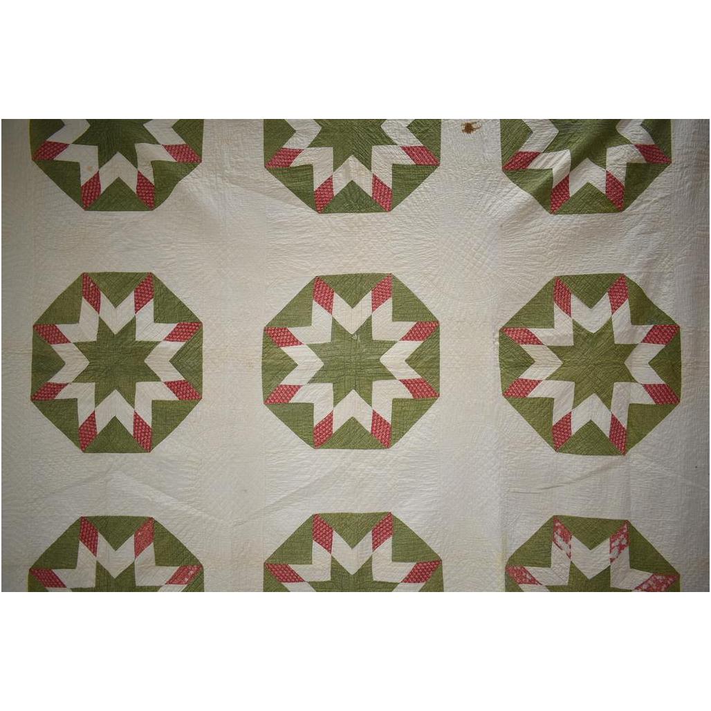 Vintage American hand made quilt. Double star in green octagon. 80" x 80".