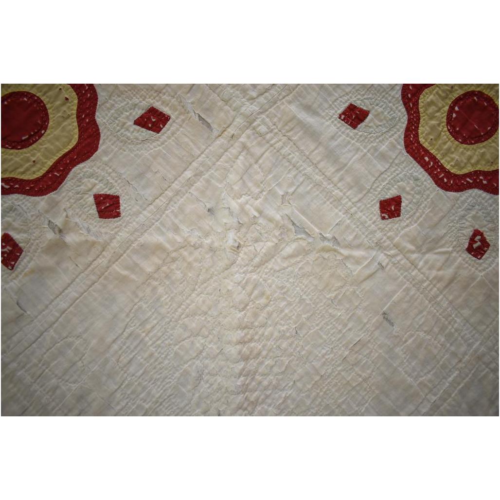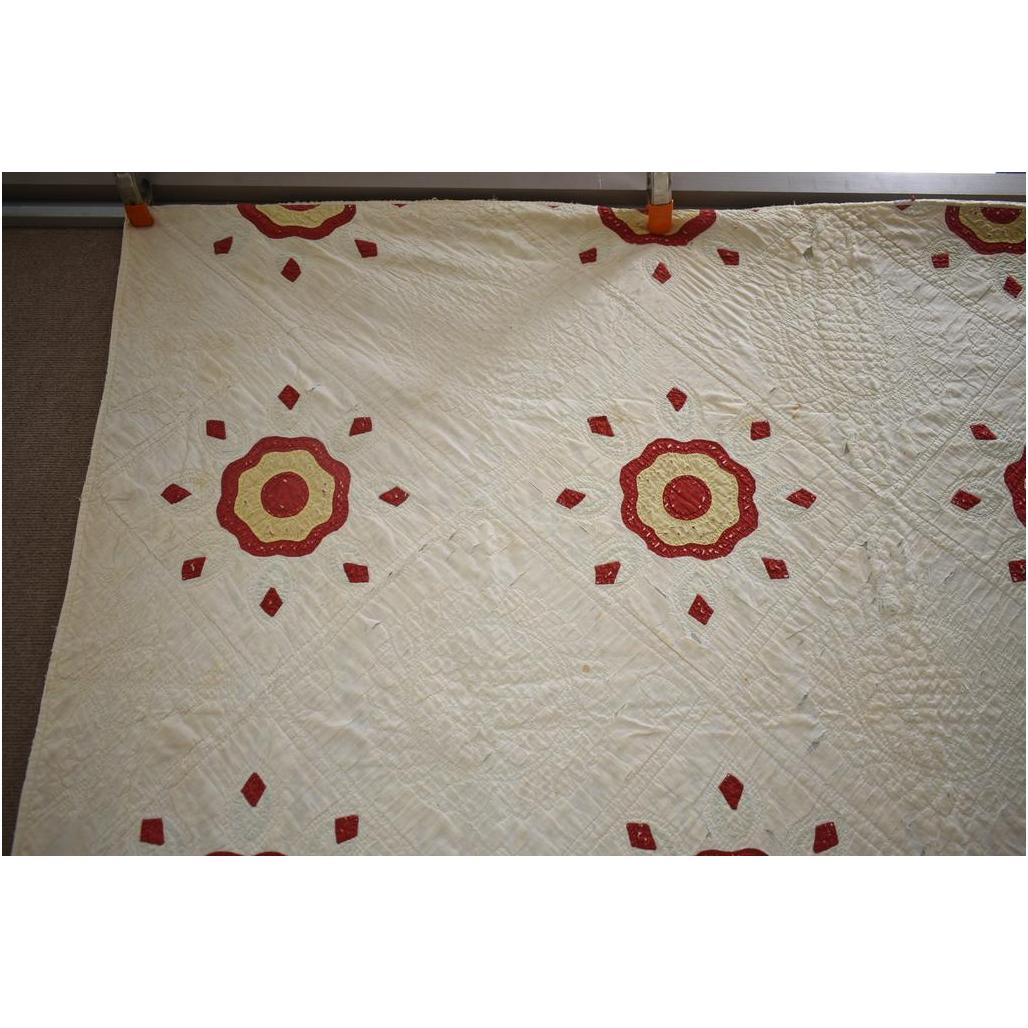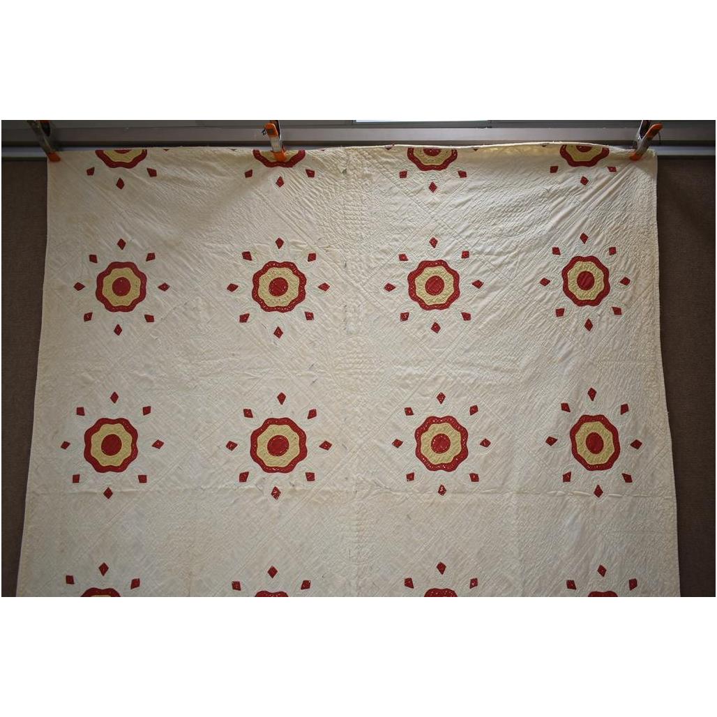Vintage American hand made quilt. Red and yellow circle with dots. 77" x 68".