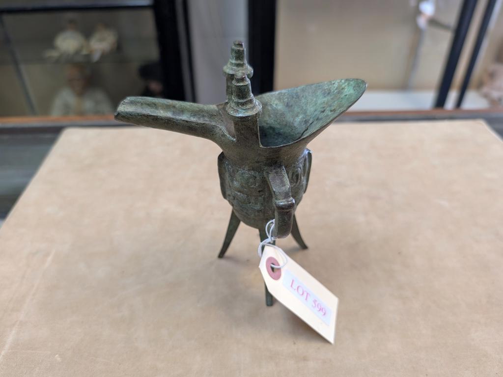 Lot 599: Vintage Bronze Libation Cup On Tripod Legs.