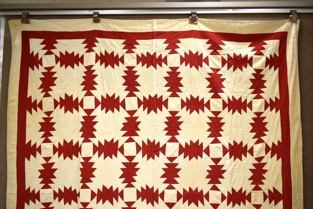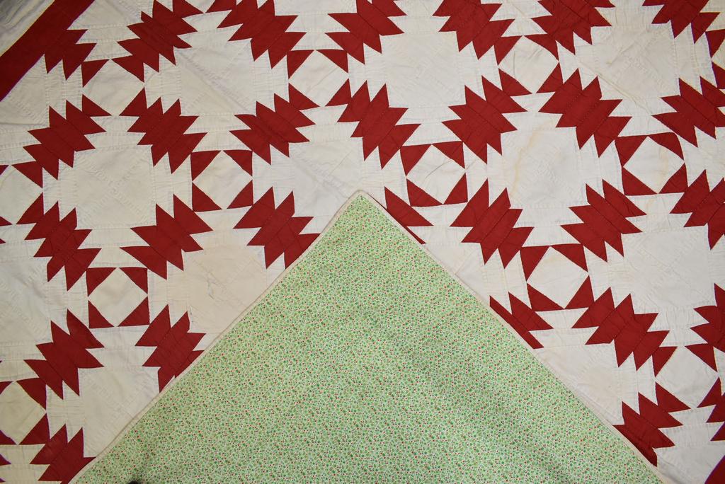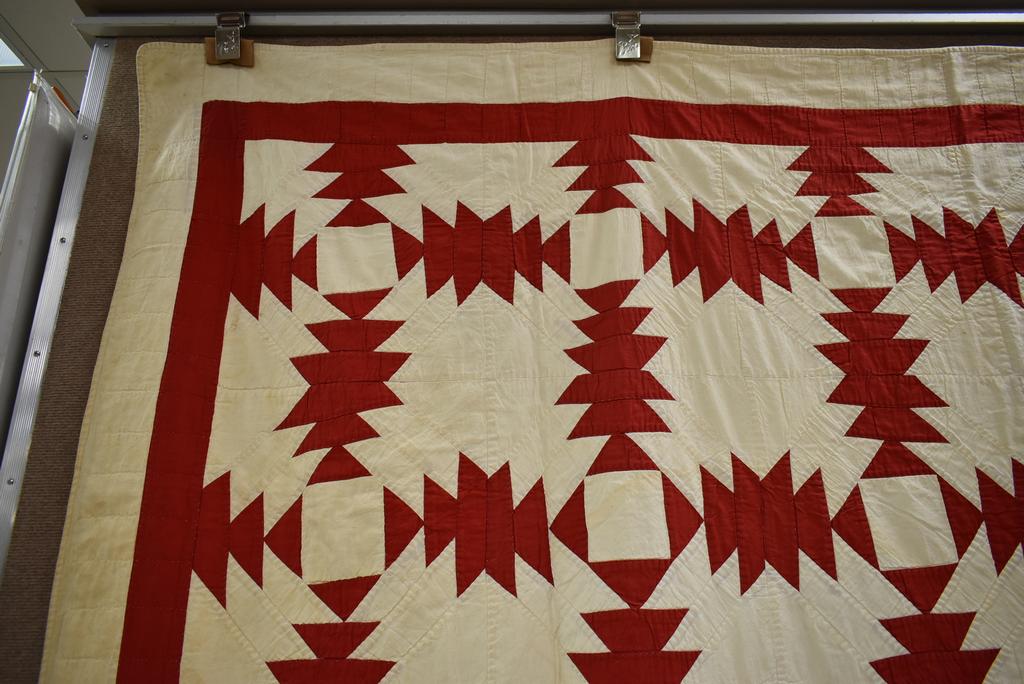 Vintage hand made American quilt in red and white. 7'1" x 6'2".