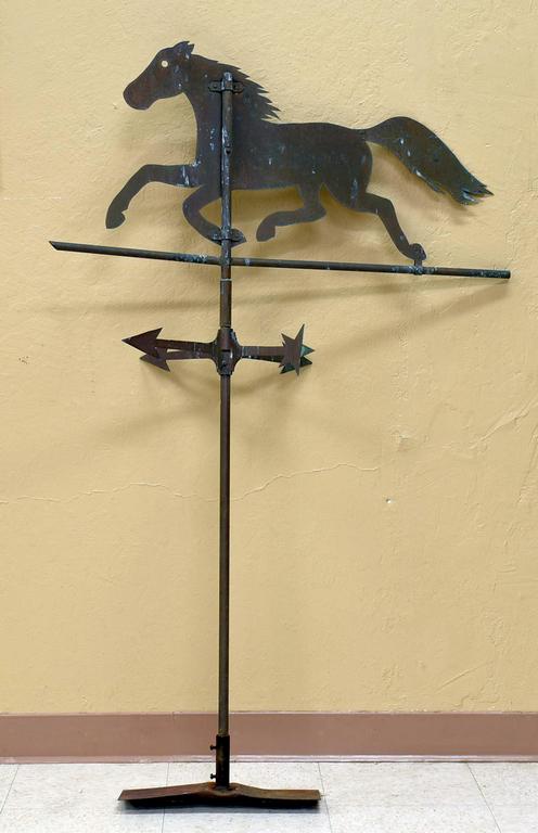 Vintage metal horse weather vane with stand. Overall: 57" tall.