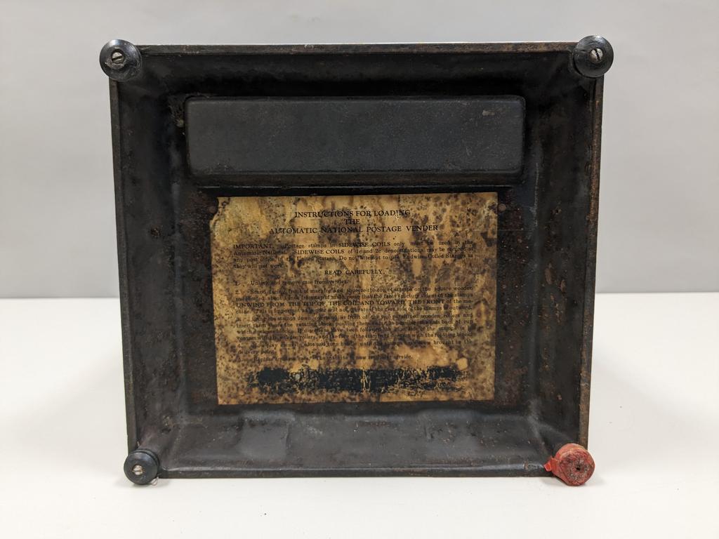 Vintage Postage Stamp Dispenser. "Sanitary & Convenient". Three 3-cent stamps for a dime, four 1-cent stamps for a nickel. Restored. 16" H, 9" W, 8" D.