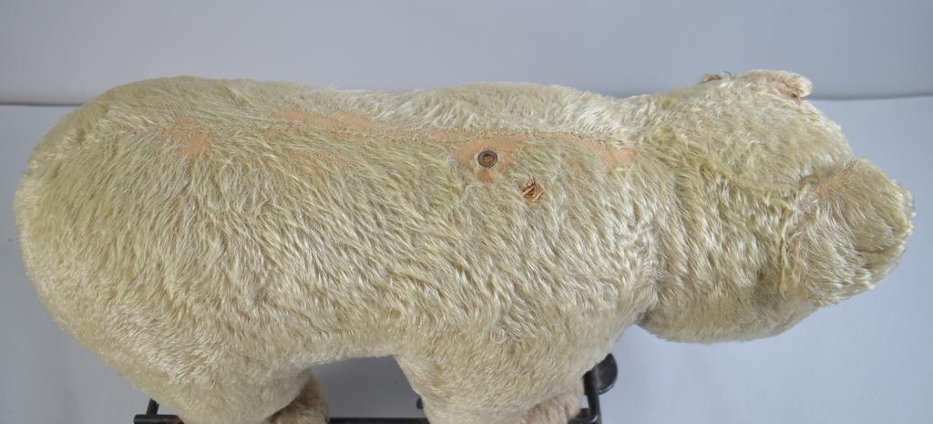 Vintage Steiff mohair bear on wheels. (No Steiff mark). Some mohair losses, small hole near the right shoulder, left ear loose. Overall: 25" W, 11" D, 16" H.