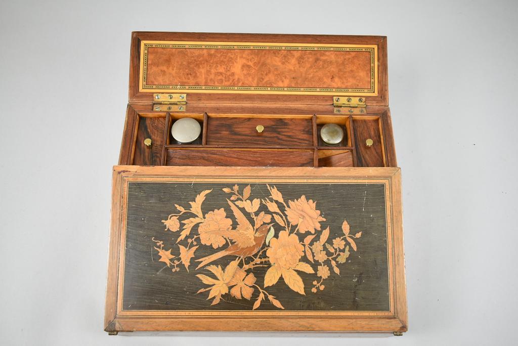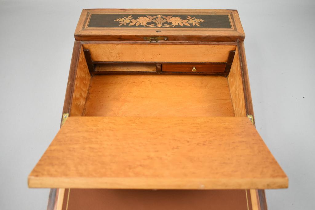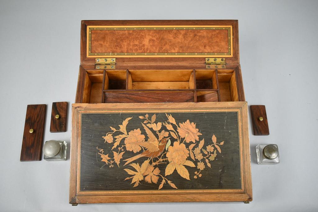 Vintage Walnut writing slope. Walnut exterior with painted bird and floral decoration. Interior with leather inset slopes with one opening to a hidden compartment. Top opens to a fitted inkwell with rosewood tops and 2 ink holders. 14 1/8" x 11 3/8" x 5" (closed).