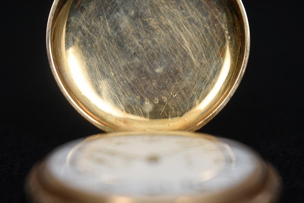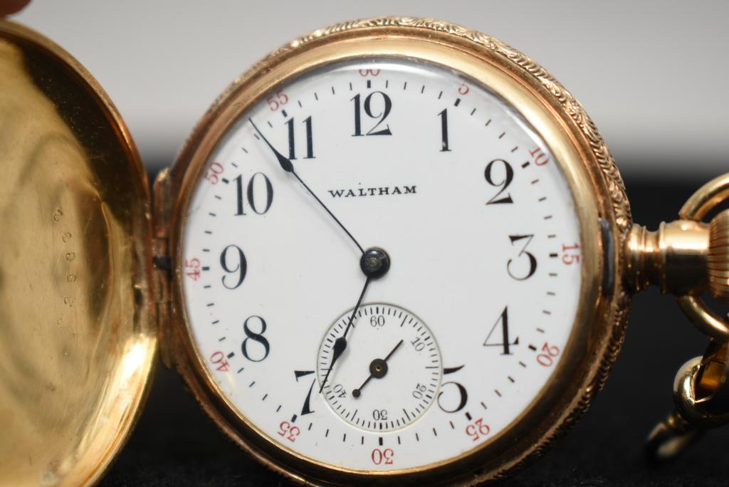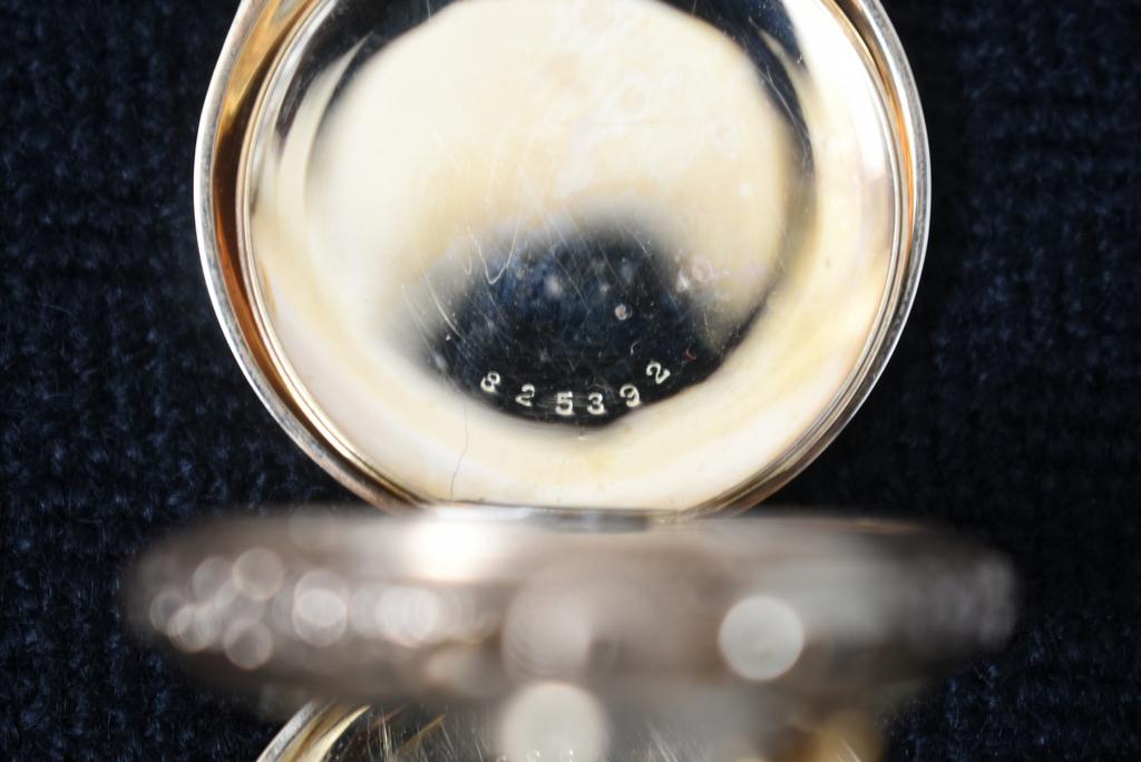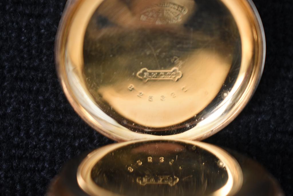 Waltham 14K gold case pocket watch. Case marked R.W.C. Co. Warranted 14K U.S. Assay. Serial no. 825392, Movement no. 14707210. 53.1 grams total.