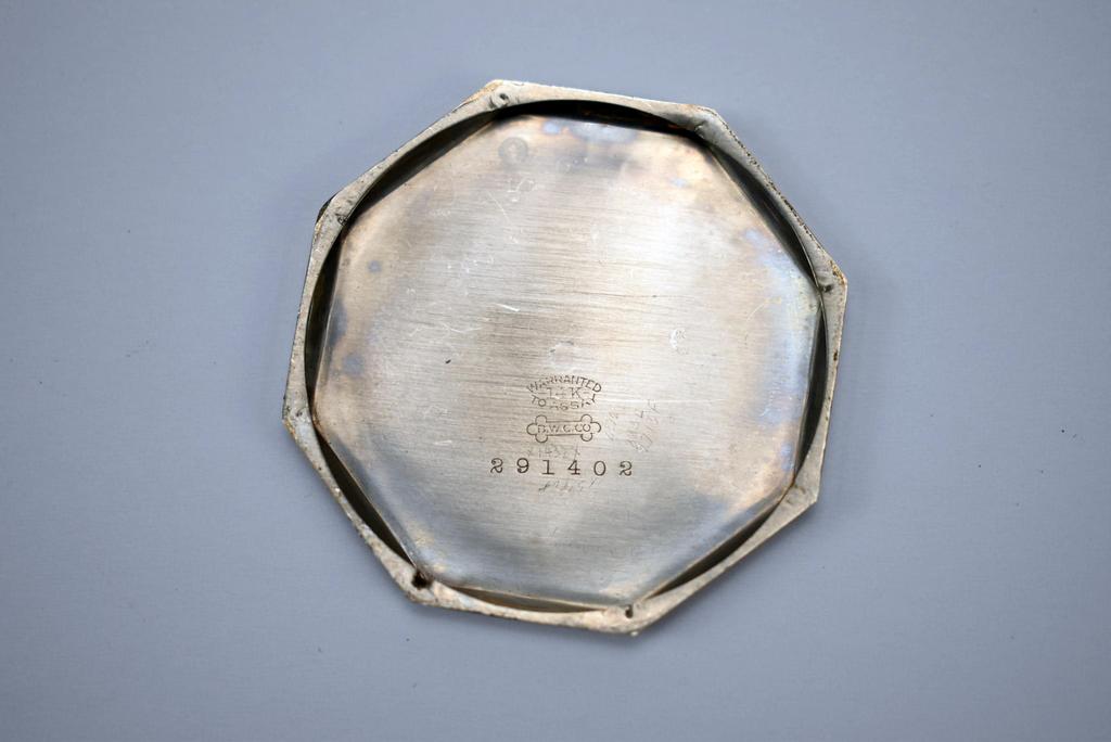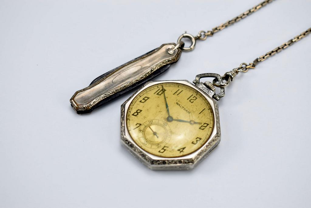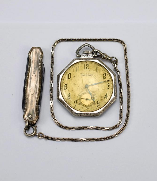 Lot 78: Waltham White Gold Case Back Pocket Watch.