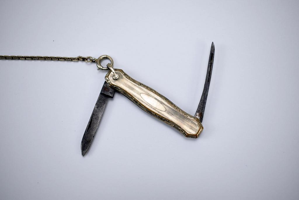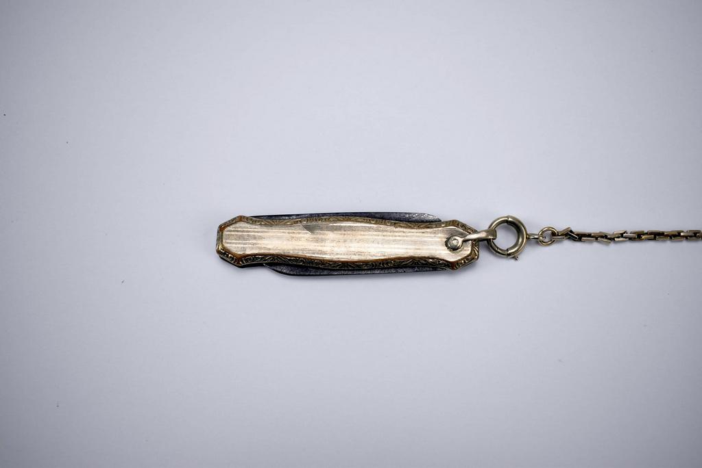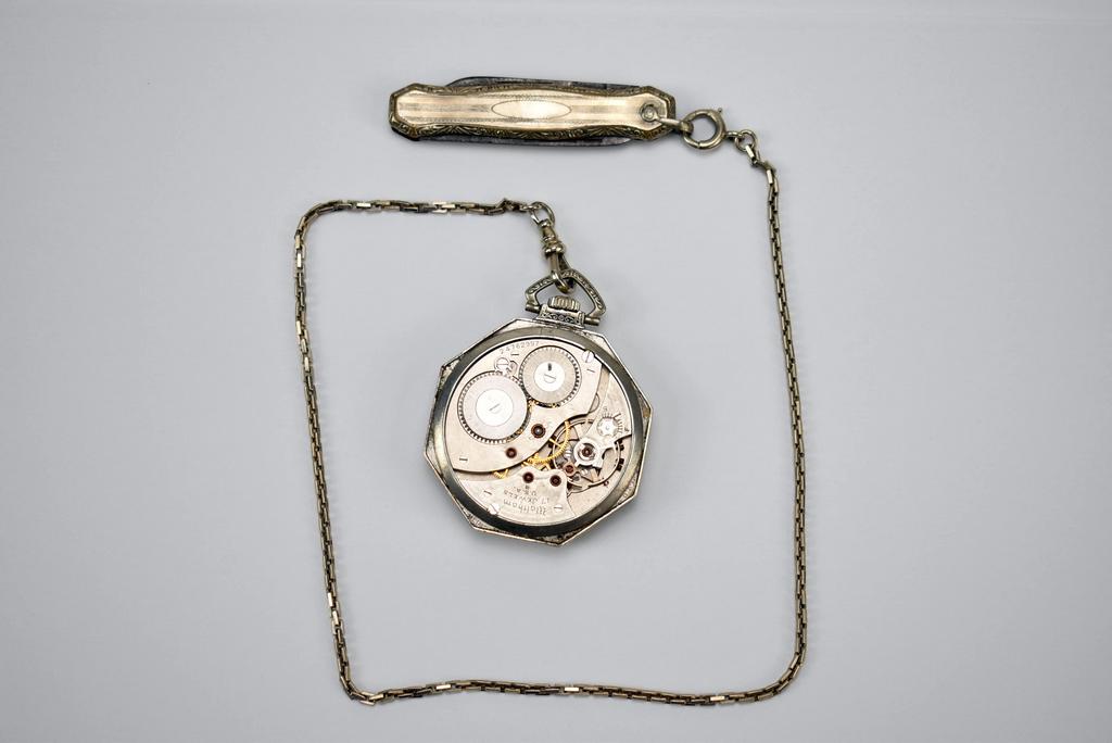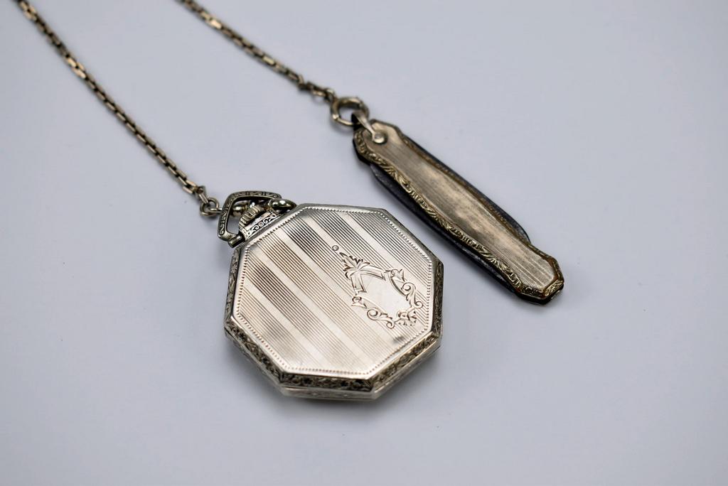 Waltham White Gold case back, open face pocket watch. B.W.C Co. case back. (Serial no. 291402, movement no. 24762997, 17 jewels). Watch: 58.8 grams total with bail. With an associated pocket knife fob chain.