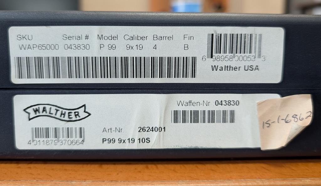 Walther P99 Semi-Automatic Pistol. Serial No. 043830, Cal: 9mm Para, black, 3.75 in. barrel length. With (5) magazines and original hard case. 1st generation manufacture.