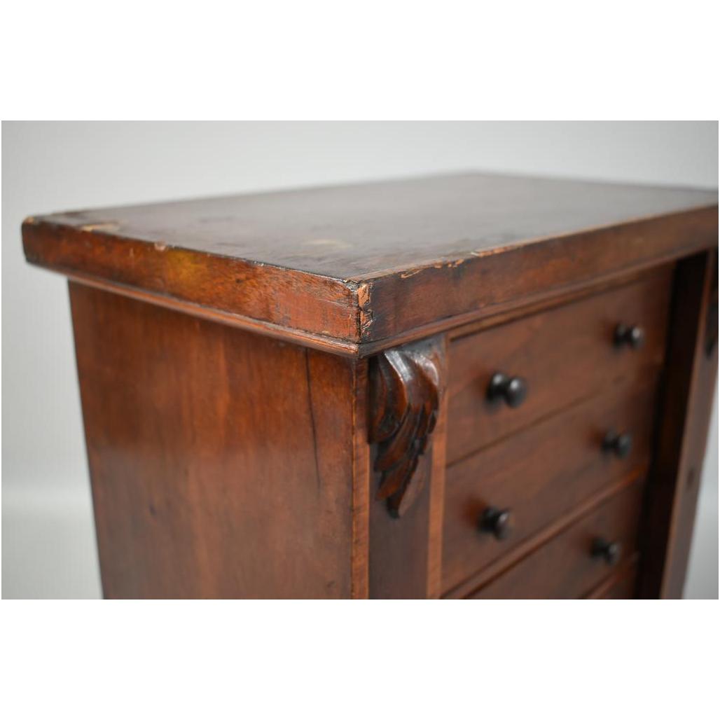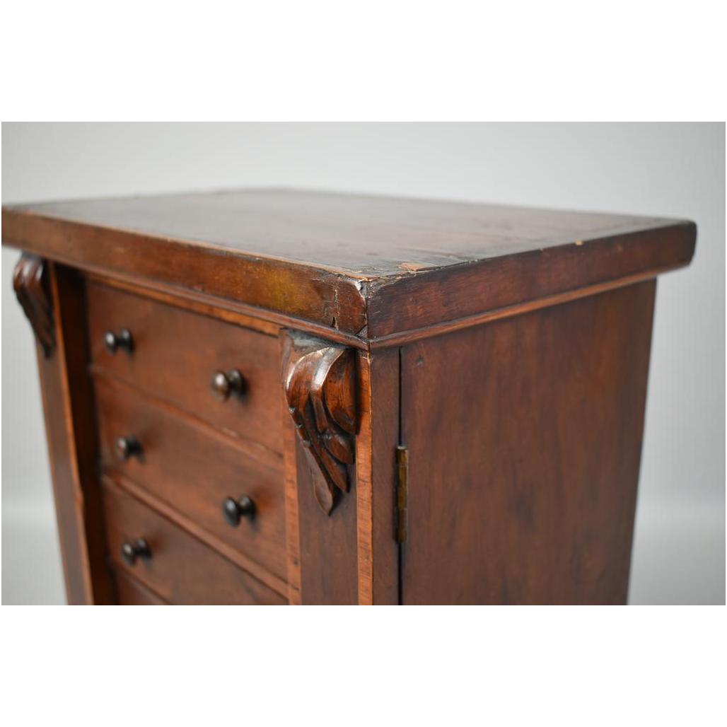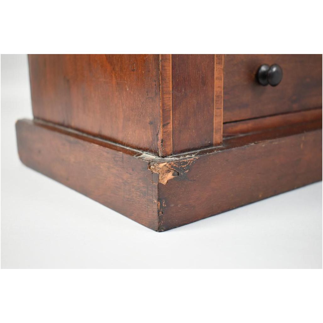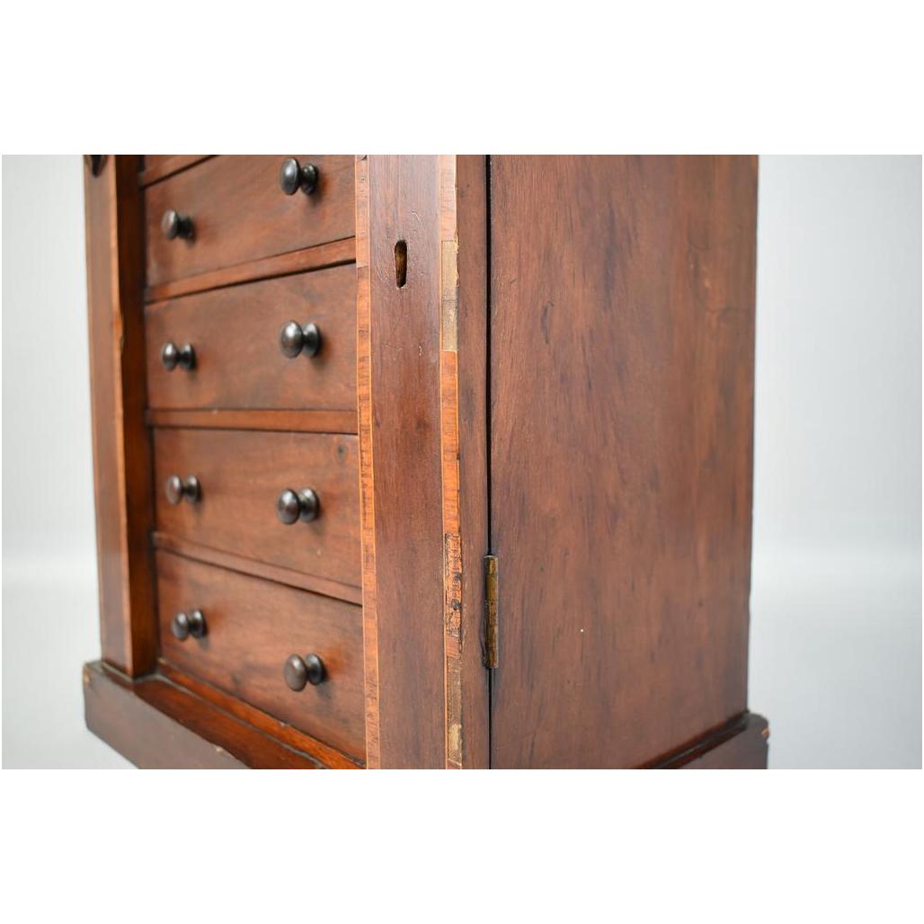 Wellington 5-drawer table top jewelry chest. 19th Century mahogany with inlay banding. 14" W, 8 5/8" D, 17" H.