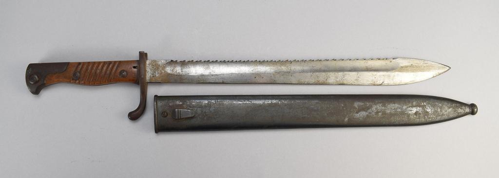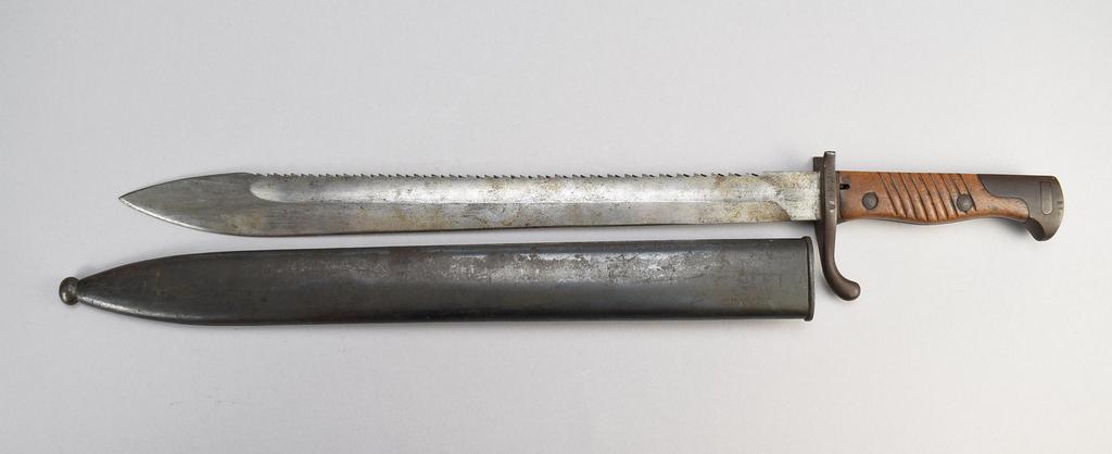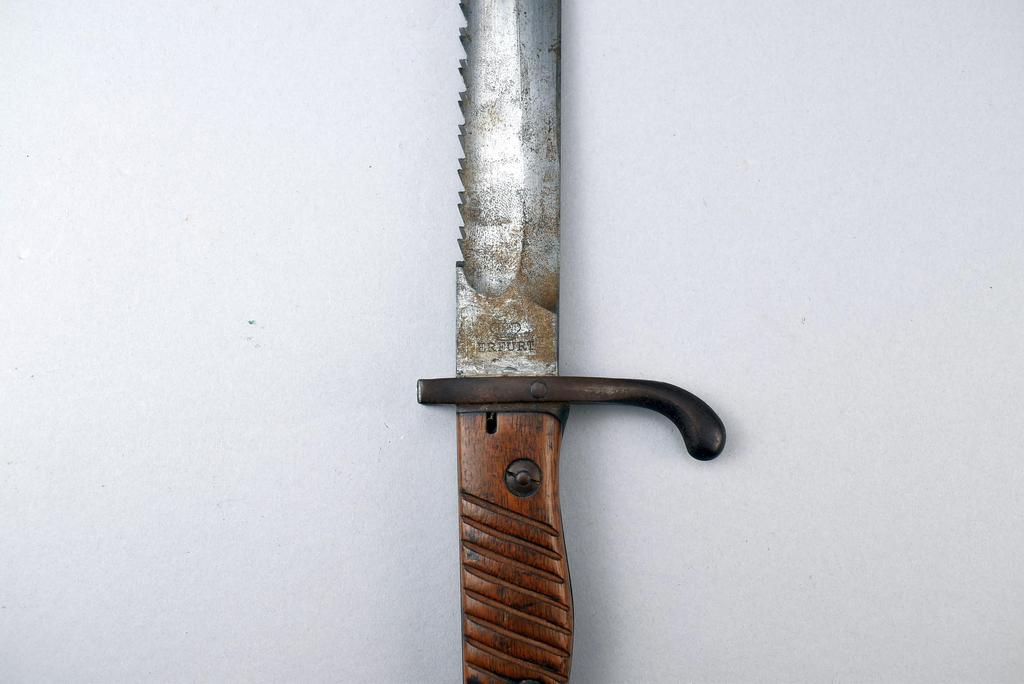 WWI German 1898/05 sawback bayonet and scabbard. Ricasso marked with imperial crown and "Erfurt". The hilt is stamped on one side "RPK 169". Dimensions: Blade 14.25 inches. Overall 19.5 inches.