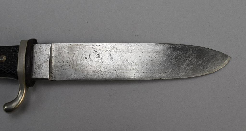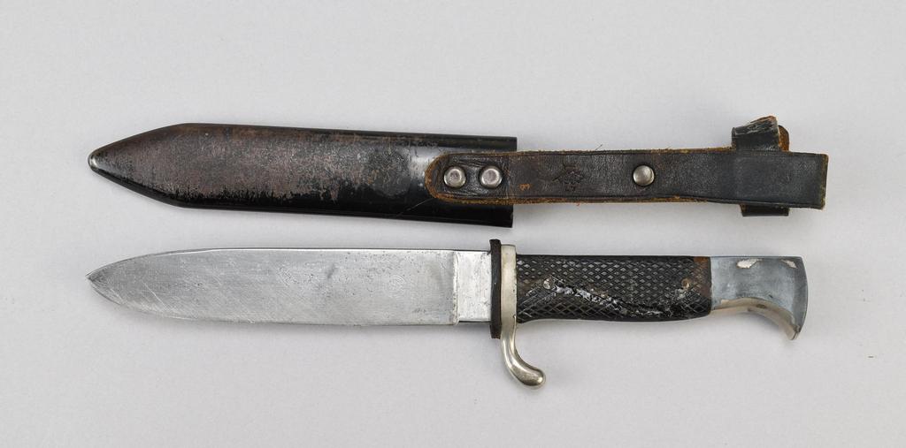 WWII German Hitler-Jungen (Hitler Youth) knife and scabbard. Blade marked Blut und Ehre!" on the front and obverse marked circle "RZM", "M7/2". Circa 1930's. Dimensions: blade 5.5 inches, overall 9.5 inches.