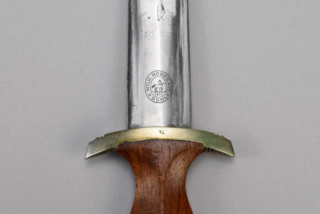 WWII German M33 Dagger and Scabbard. The obverse of the blade has the motto "Alles fur Deutschland". The ricasso is marked "Wilh. Kober & Co., Suhl" with centaur logo. The lower cross guard is stamped with "Th". Dagger: blade 8.5 in, overall 13.5 in.