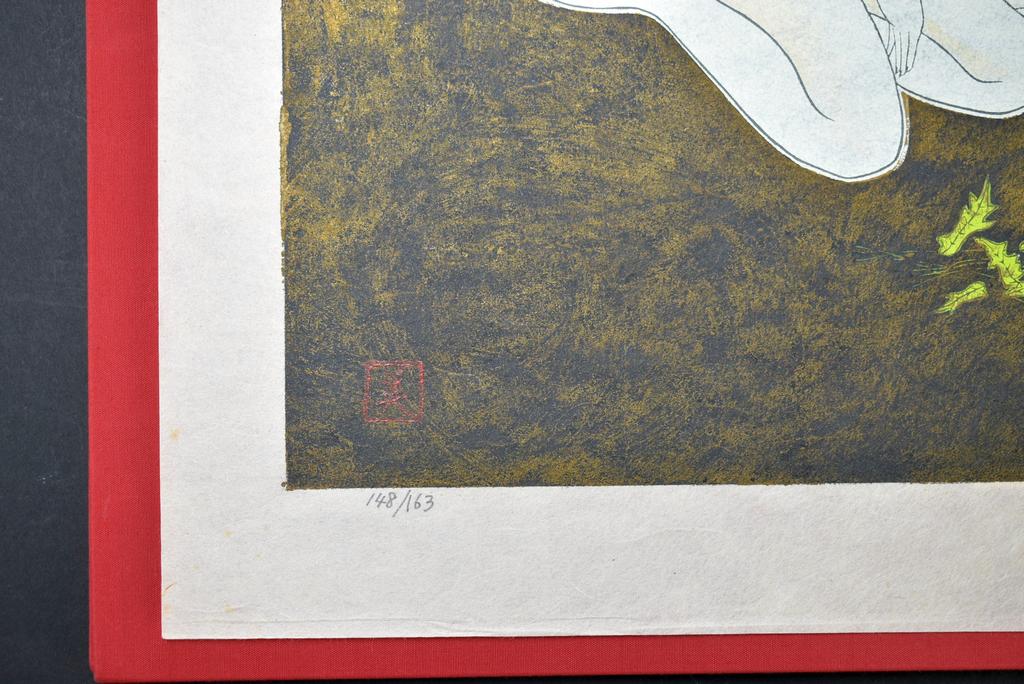 Yoshimi Okamoto, portfolio with 5 woodblock prints. Pencil signed and numbered 148/163, Tsuyu, Hanamewarabe, Sei, Asa, Sakura (20" x 14" each). Front cover with Koeda print.