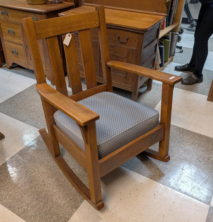Lot 407: Oak Mission Style Rocker With Upholstered Seat.