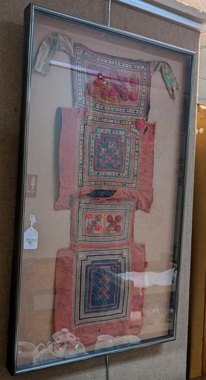 Lot 414: Mayan Embroidered Textile Baby Carrier. Shadow Box Framed.