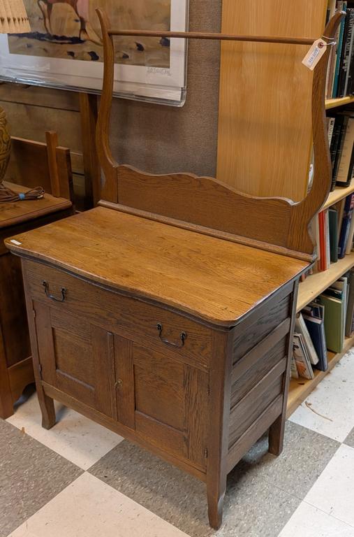 Lot 416: Early 20th C. Oak Single Door, 2-Drawer Washstand With Towel Rack.