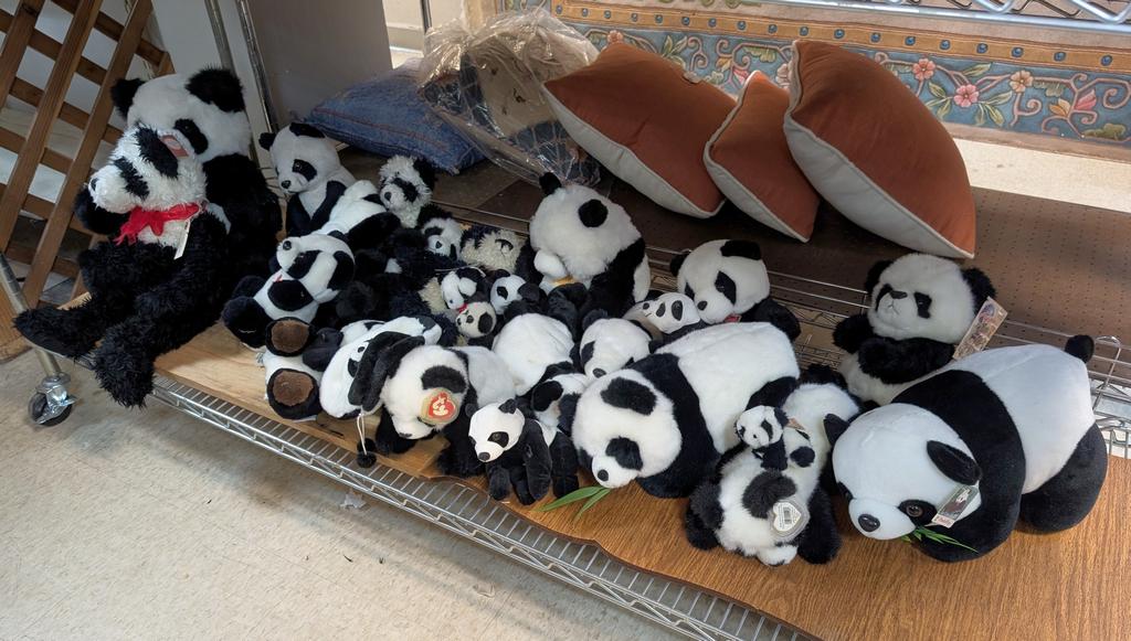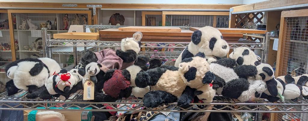 Lot 497: Shelf Of Panda Dolls.