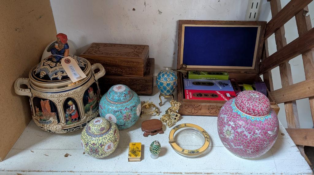Lot 441: Shelf Of Knick Knacks Incl. Asian Ginger Jars, Boxes.