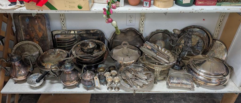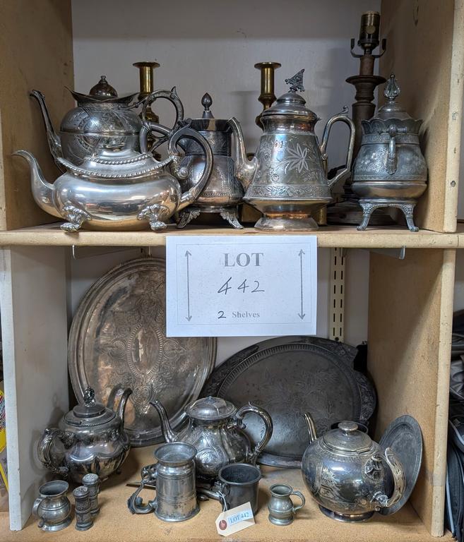 Lot 442: (2) Shelves Of Silver Plated Items Incl. Coffee Pots, Platters.