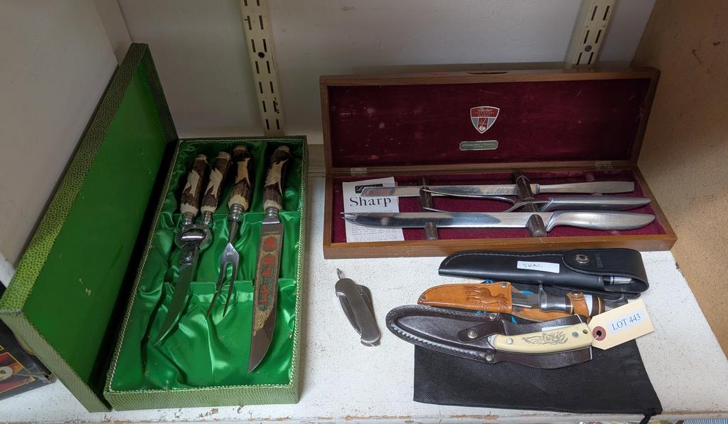 Lot 443: Shelf Of Cutlery And Hunting Knives.