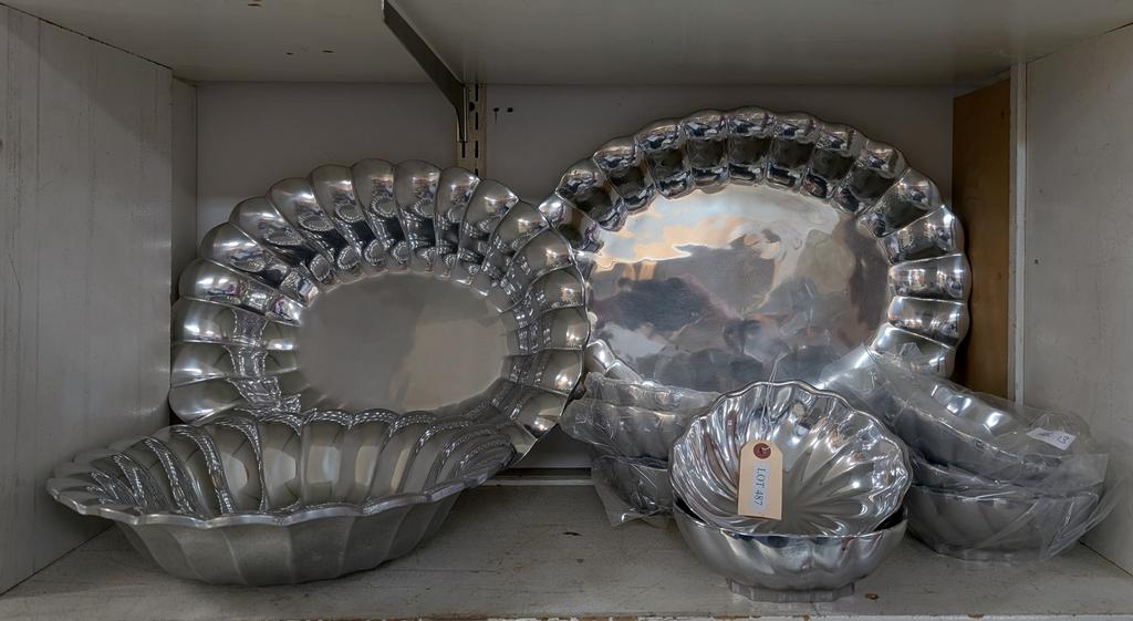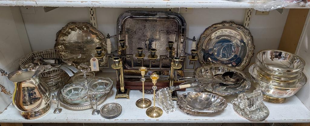 Lot 450: Shelf Of Silver Plated Items Incl. Bowls, Pitcher, Serving Trays.