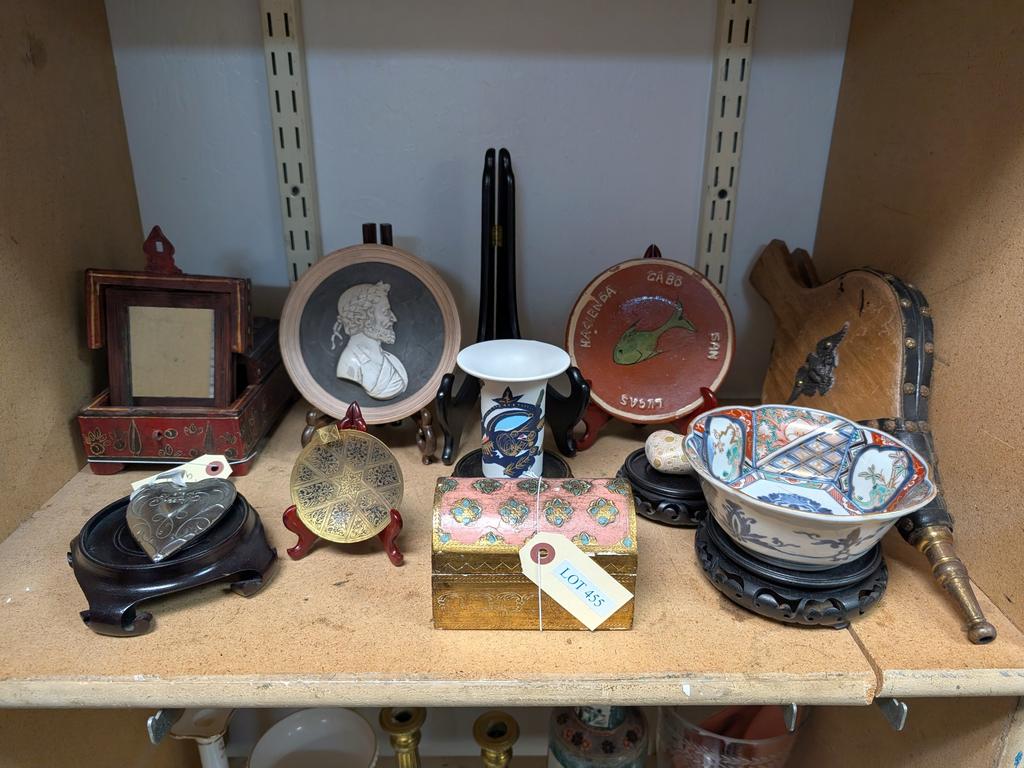 Lot 455: Shelf Of Knick Knacks Incl. Chinese Bowl, Bellows.