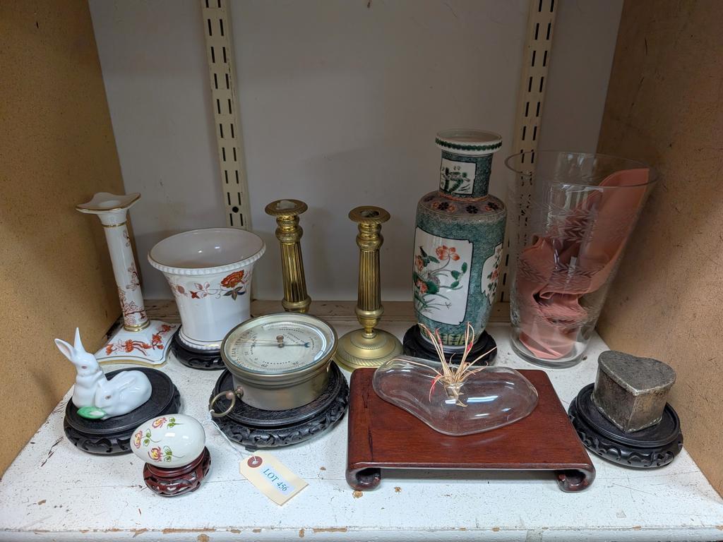 Lot 456: Shelf Of Knick Knacks Incl. Asian Vase, Candle Holders.