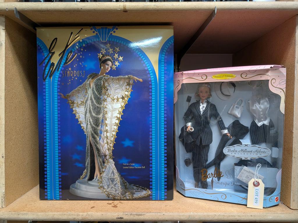Lot 459: Barbie Millicent Roberts Pinstripe Power Doll & Erte Stardust Doll In Boxes.